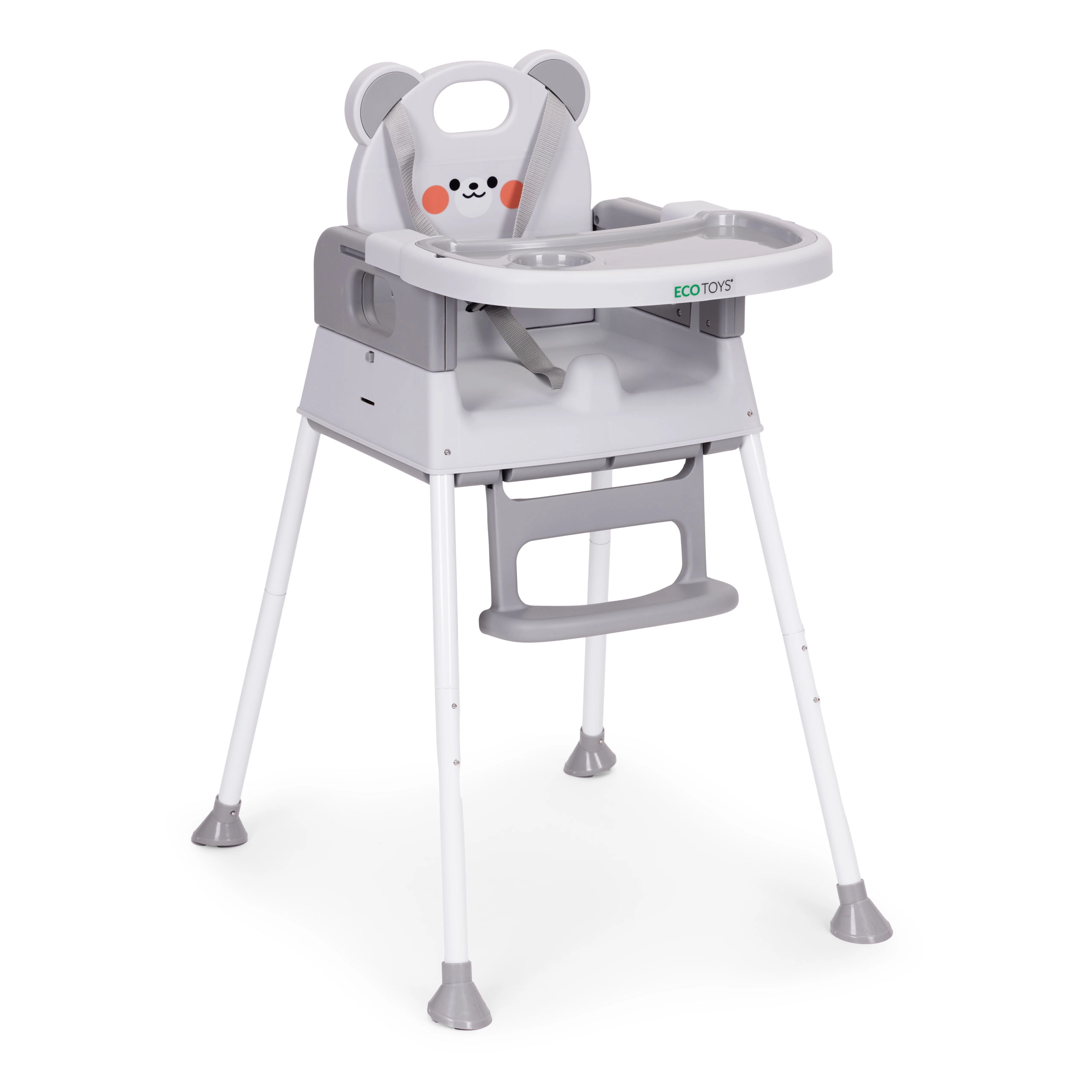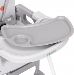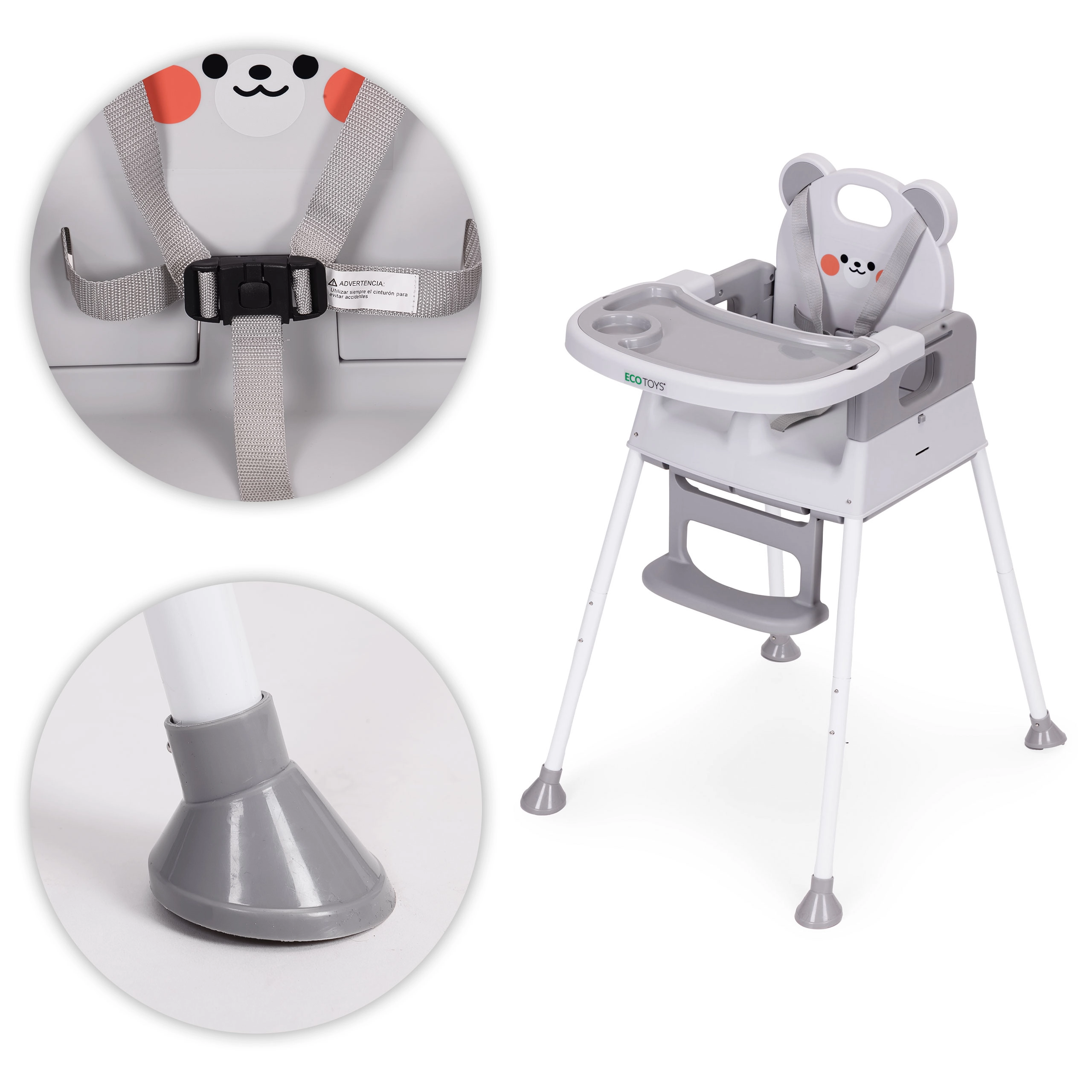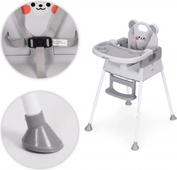 Za varnost skrbijo 5-točkovni pas, mednožni varnostni omejevalnik proti zdrsu in protizdrsne nogice. Širok dvojni pladenj z dvignjenimi robovi in držalom za skodelico je nastavljiv, zgornji sloj pa je enostavno odstraniti in pomiti v pomivalnem stroju. Opora za noge in ergonomski sedež zagotavljata pravilno sedenje in udobje pri jedi ter igri.