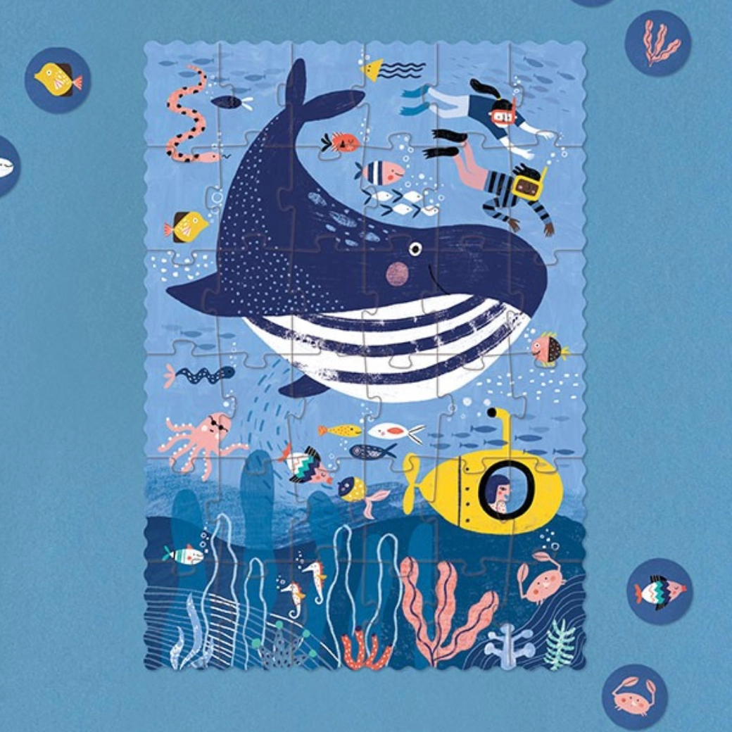 Odkrijte čar oceana z žepno sestavljanko Londji Morje. Kompaktna sestavljanka z 36 kosi je idealna za na pot in v otroški nahrbtnik. Otroci bodo ob sestavljanju spoznali sinjega kita in druge morske živali, razvijali potrpežljivost, logiko in fino motoriko.