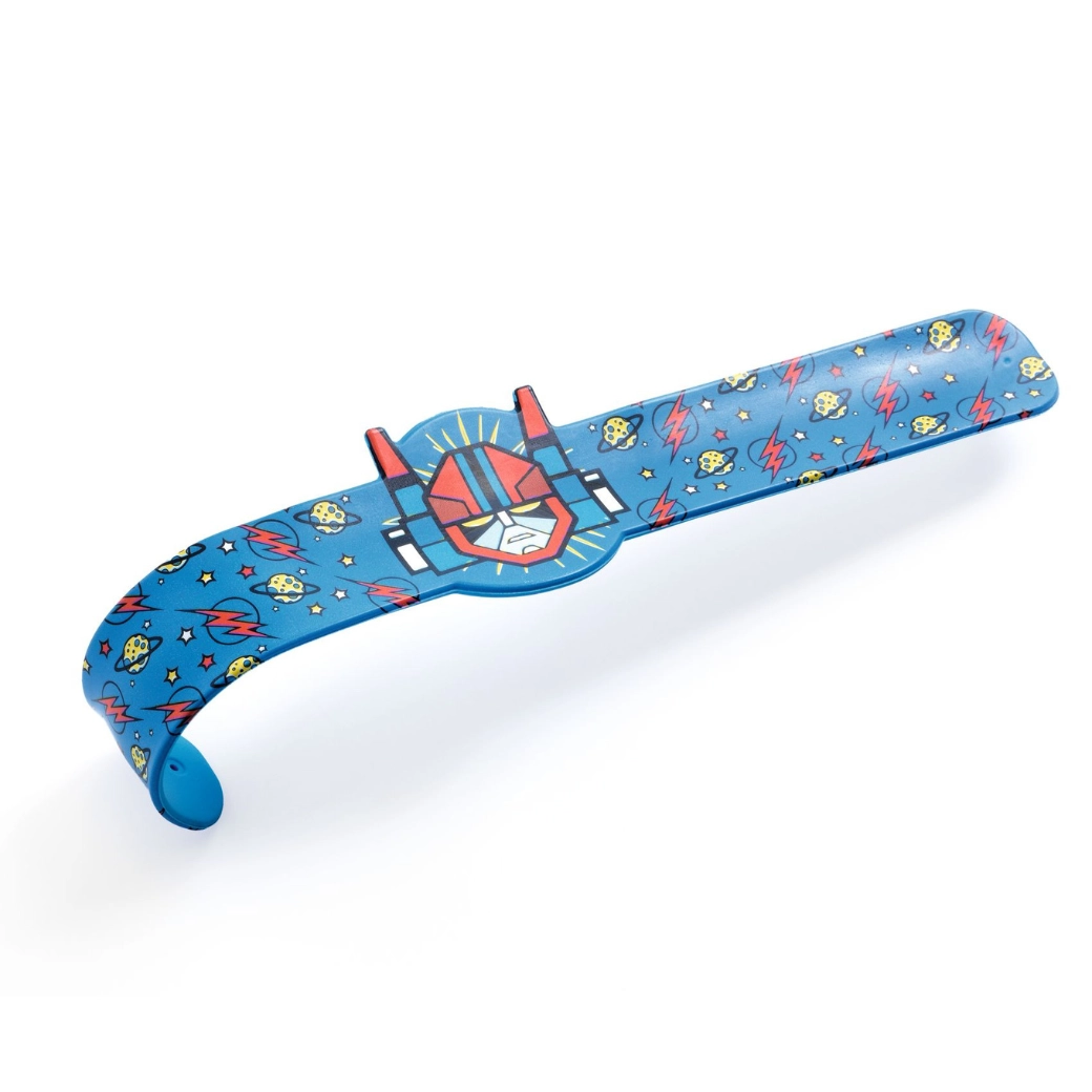 Odkrijte igrive slap zapestnice DJECO z motivi superjunakov, dinozavrov, tigrov in robotov. Zahvaljujoč prožnemu kovinskemu traku, prevlečenemu z vzdržljivo plastiko, se zapestnica po lahkem »klaku« sama ovije okoli roke. Otroci jih imajo radi zaradi varne in hitre namestitve ter izrazitega dizajna.
