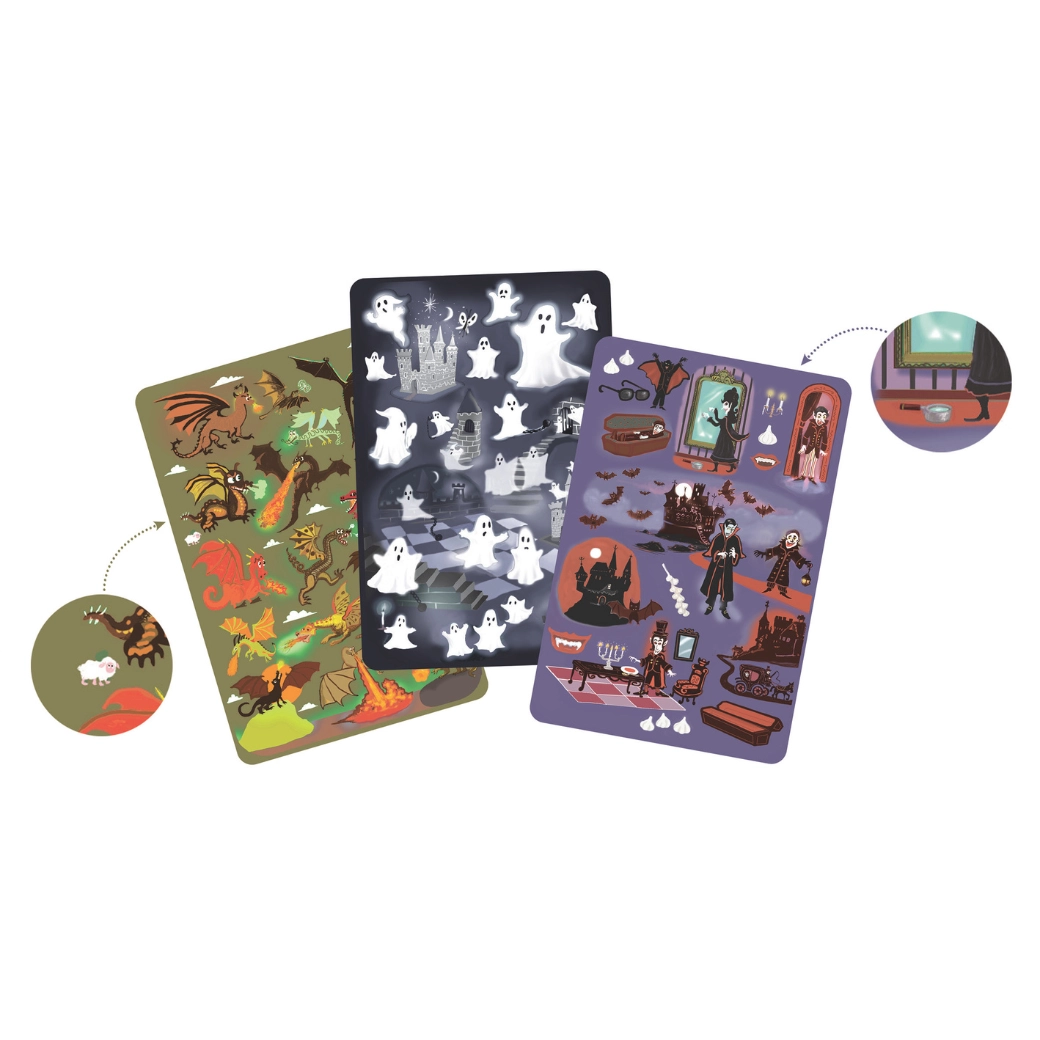Tematske nalepke z zmaji, duhovi in vampirji so odlične za ustvarjanje, okraševanje zvezkov ali kot nagrade po igri. Spodbujajo dodatno ustvarjalno igro.