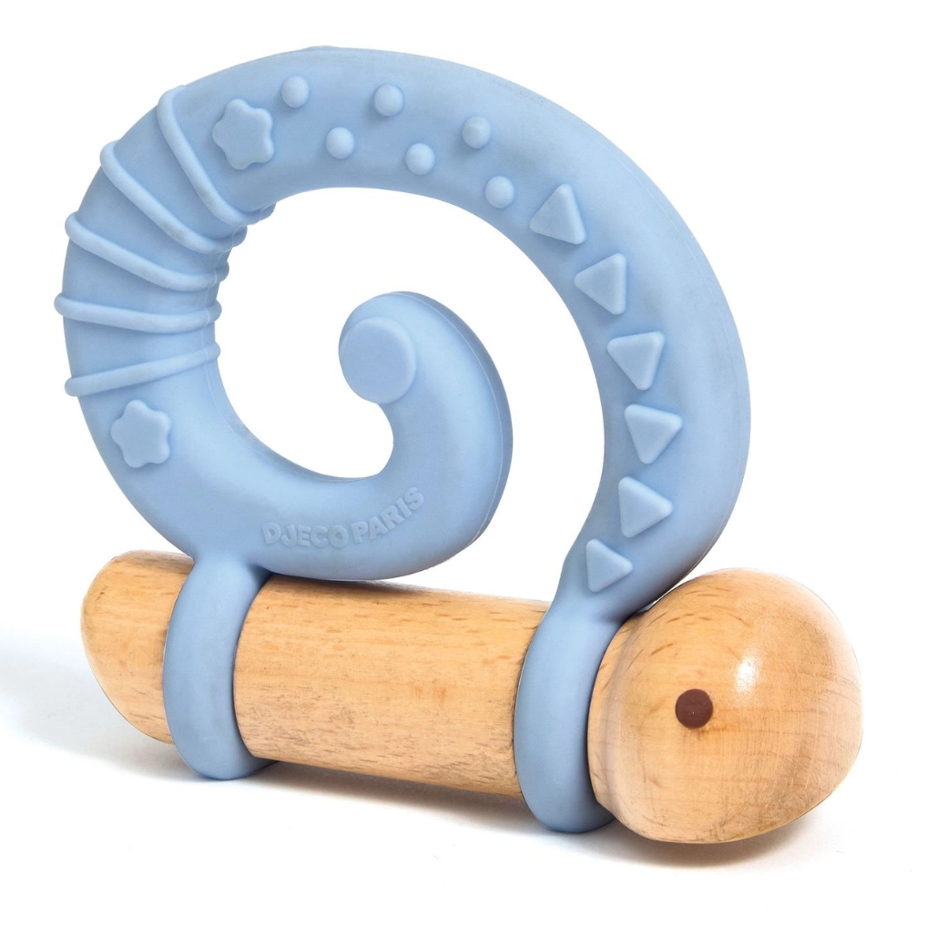 Mehek silikon z različnimi teksturami masira dlesni in lajša nelagodje pri izraščanju zob. Lahka zasnova in lesen ročaj olajšata prijem malim ročicam.