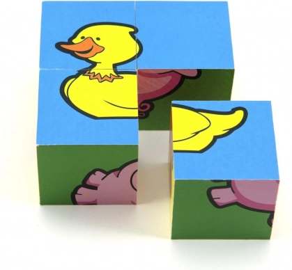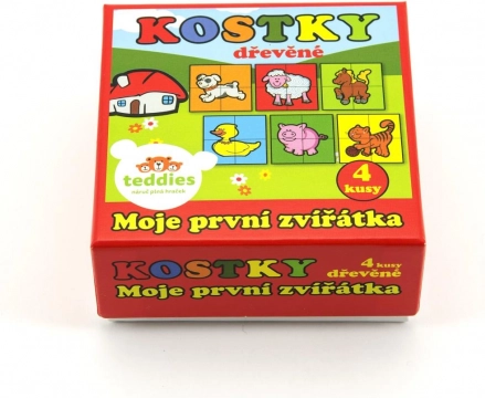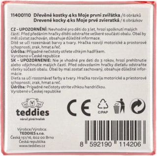 Lesene slikovne kocke Moja prva živalca znamke TEDDIES so odlična izbira za prve sestavljanke. Štiri kakovostne lesene kocke v priročni kartonski škatli omogočajo sestavljanje šestih različnih motivov domačih živali. Otroci bodo uživali pri sestavljanju slik ter pri gradnji stolpov, gradov ali ograd za živali.
