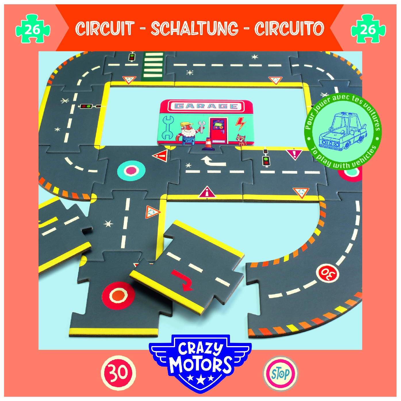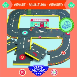 Zgradite otrokom lastno mesto hitrosti z velikansko puzzle dirkalno stezo CRAZY MOTORS. Trdni koščki iz odpornega materiala se zlahka sestavljajo in ustvarjajo realistične ceste z voznimi pasovi, semaforji, prometnimi znaki, parkiriščem in krožiščem. Idealno za igro z avtomobilčki, razvoj fine motorike, domišljije in prometne vzgoje.