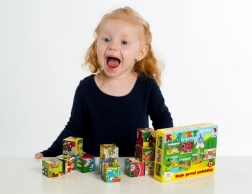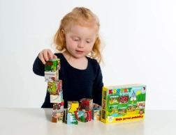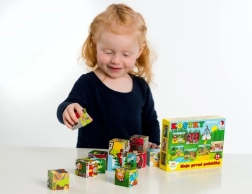 Ta set 12 lesenih slikovnih kock v čvrsti kartonski škatli prinaša otrokom veselje pri sestavljanju in prostem grajenju. Iz kock boste sestavili 6 očarljivih pravljičnih prizorov – od Rdeče kapice do Janka in Metke – hkrati pa boste iz njih gradili dimnike, gradove ali ograde za živalice.