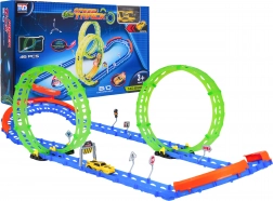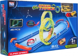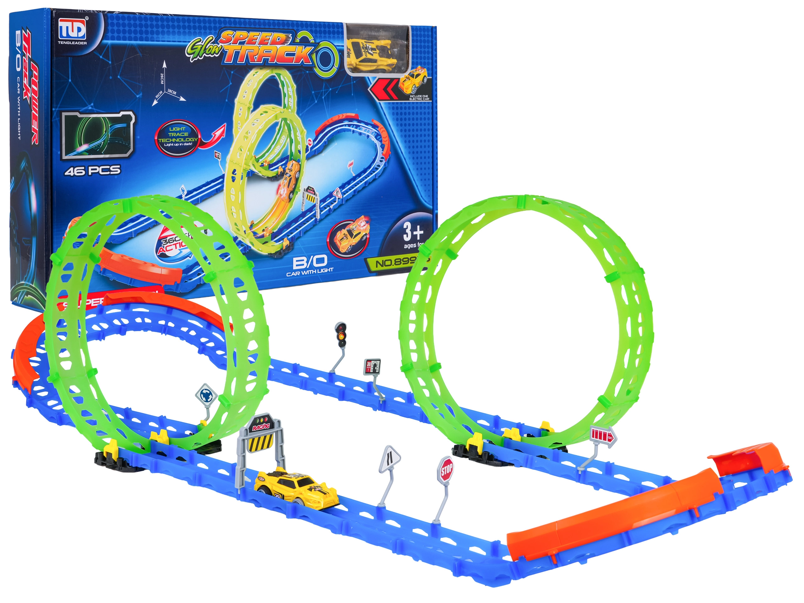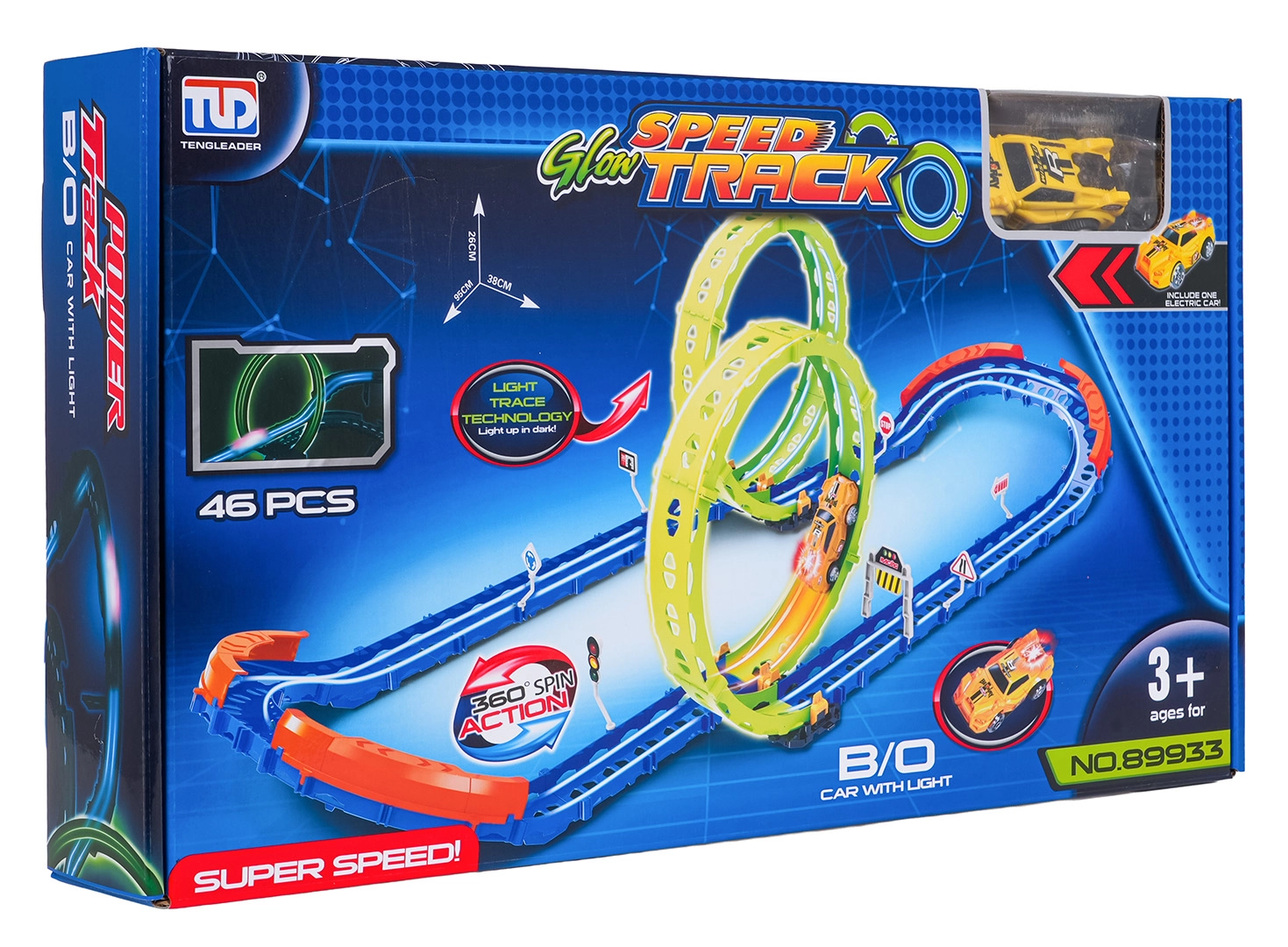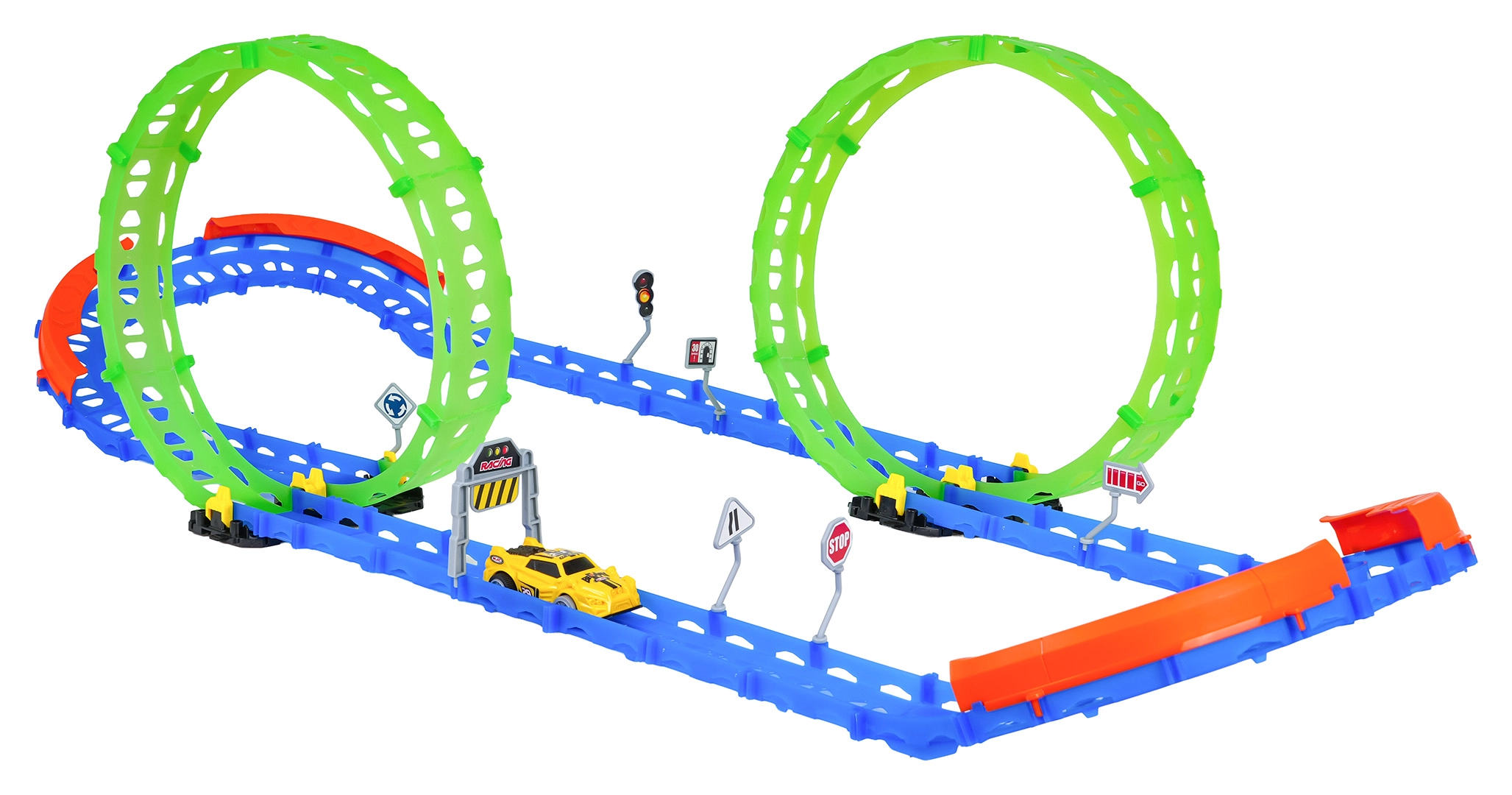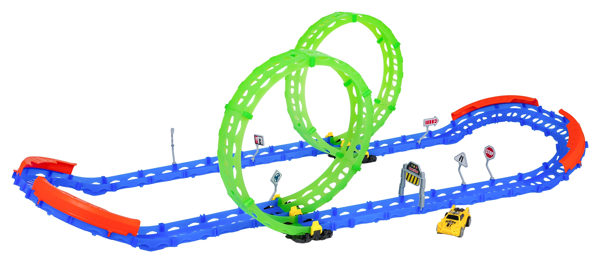 Ta fluorescenčna dirkalna steza je idealna za otroke od 3. leta dalje. Zaradi dveh velikih zank in trdnih stranskih ovir avtomobilček varno pelje tudi skozi ostre ovinke. Svetlobni elementi razsvetlijo vožnjo v somraku in spremenijo sobo v mali dirkalni krog.