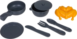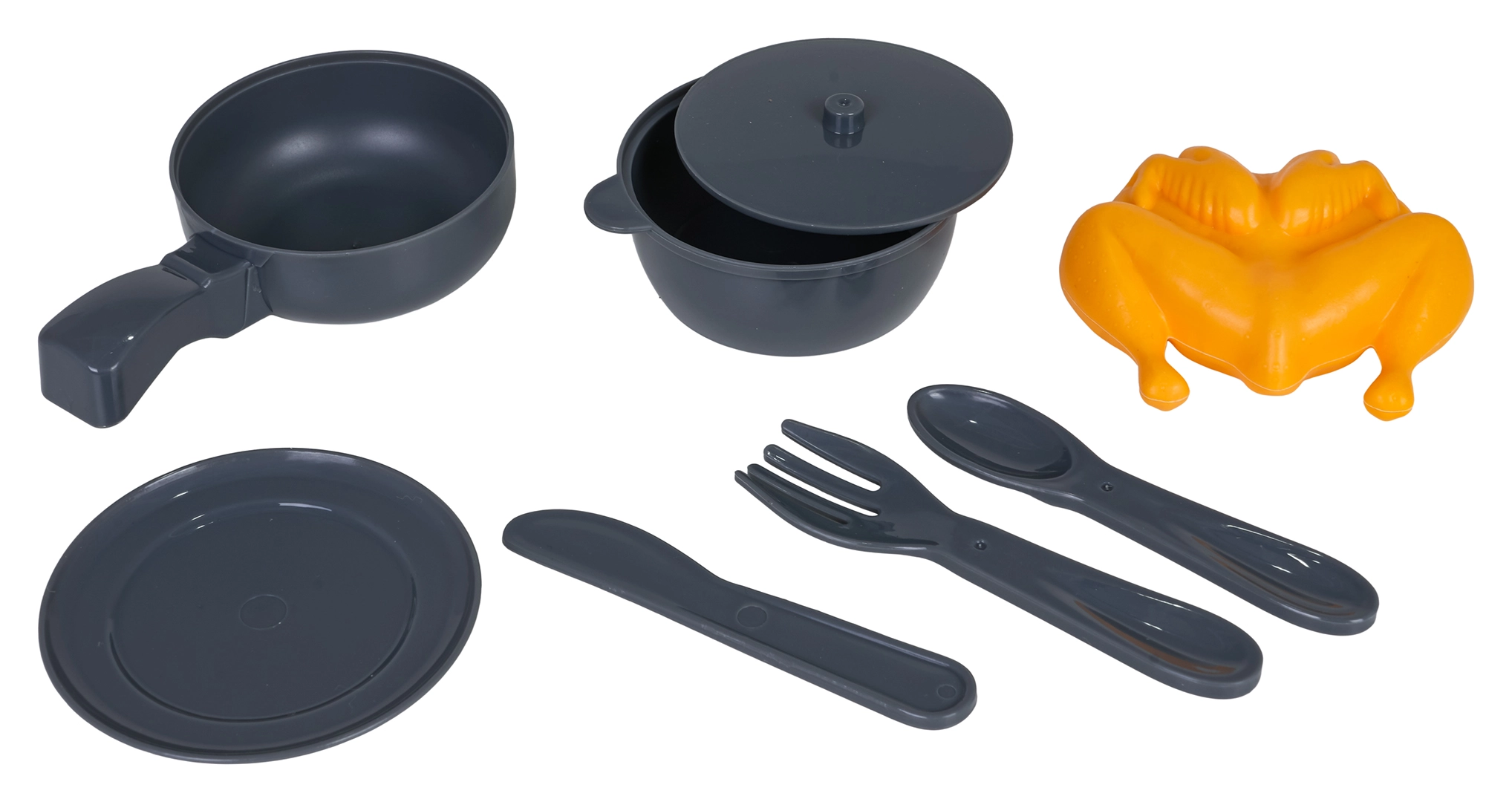 V kompletu so ponev, lonec s pokrovko, krožniček, pribor in atrapa piščanca – vse za popolno vlogo malega kuharja.