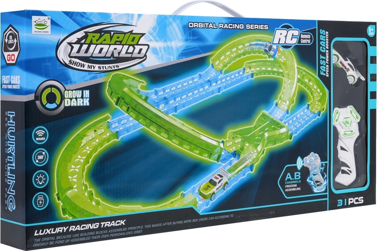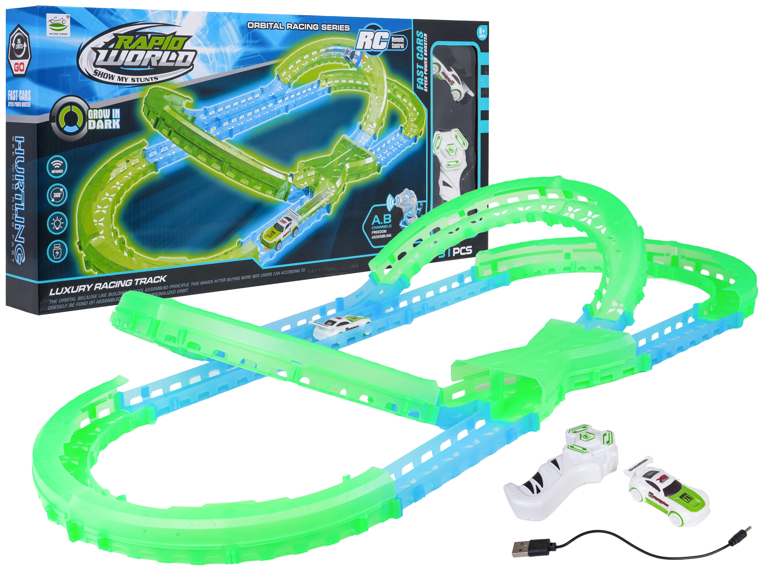 Ta velika svetleča dirkalna steza je idealna za otroke od 6 let. Fluorescenčni deli svetijo v temi, avtomobilček z LED osvetlitvijo pa med vožnjo ustvarja očarljive svetlobne efekte. V paketu so daljinski upravljalnik, USB kabel za polnjenje in vse potrebno za gradnjo stabilne in zabavne steze.