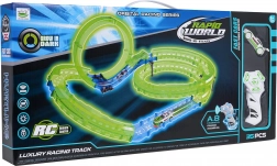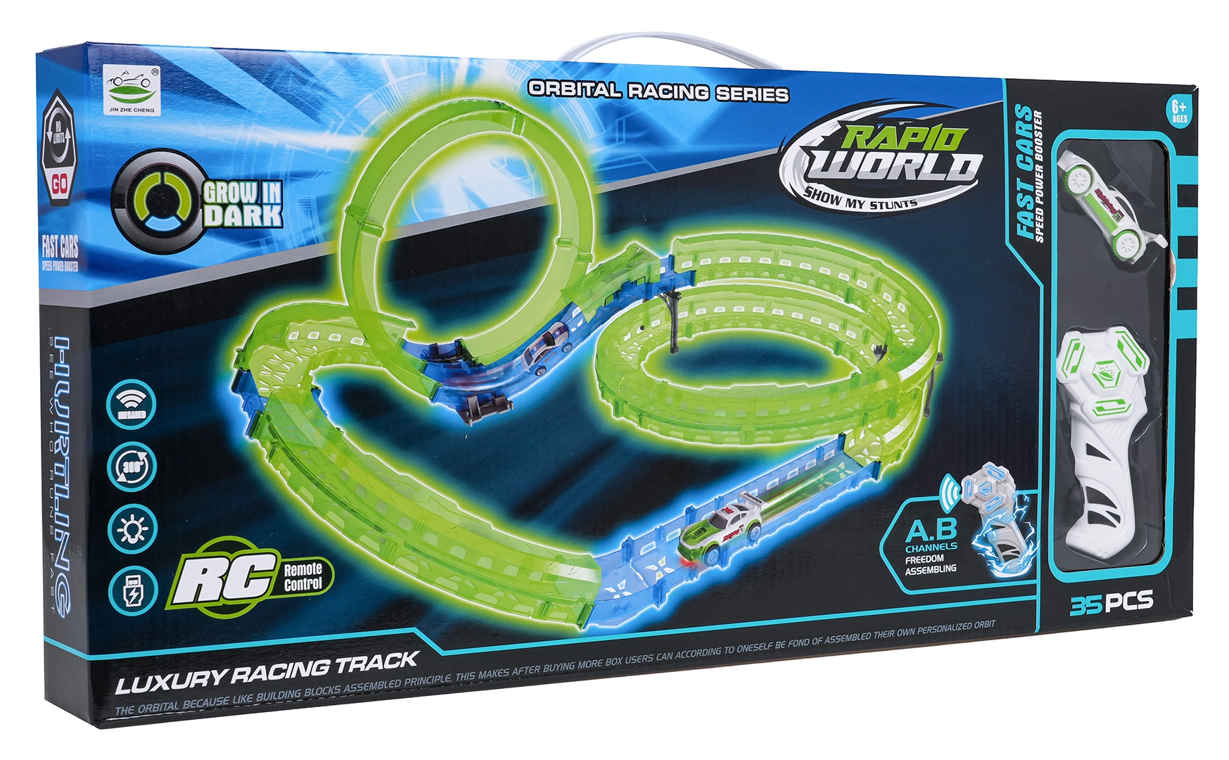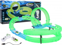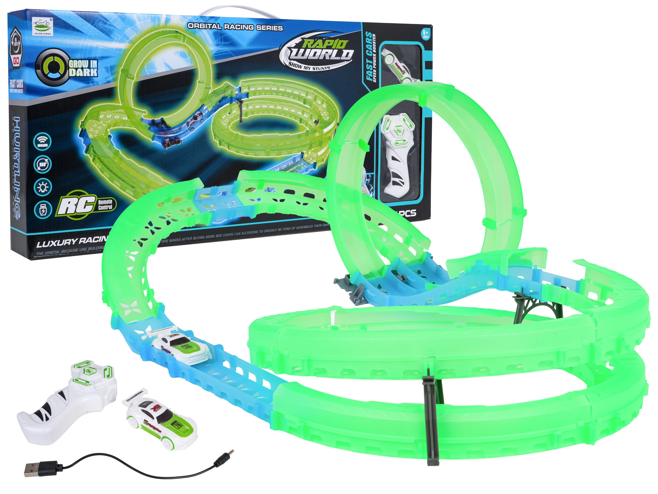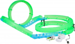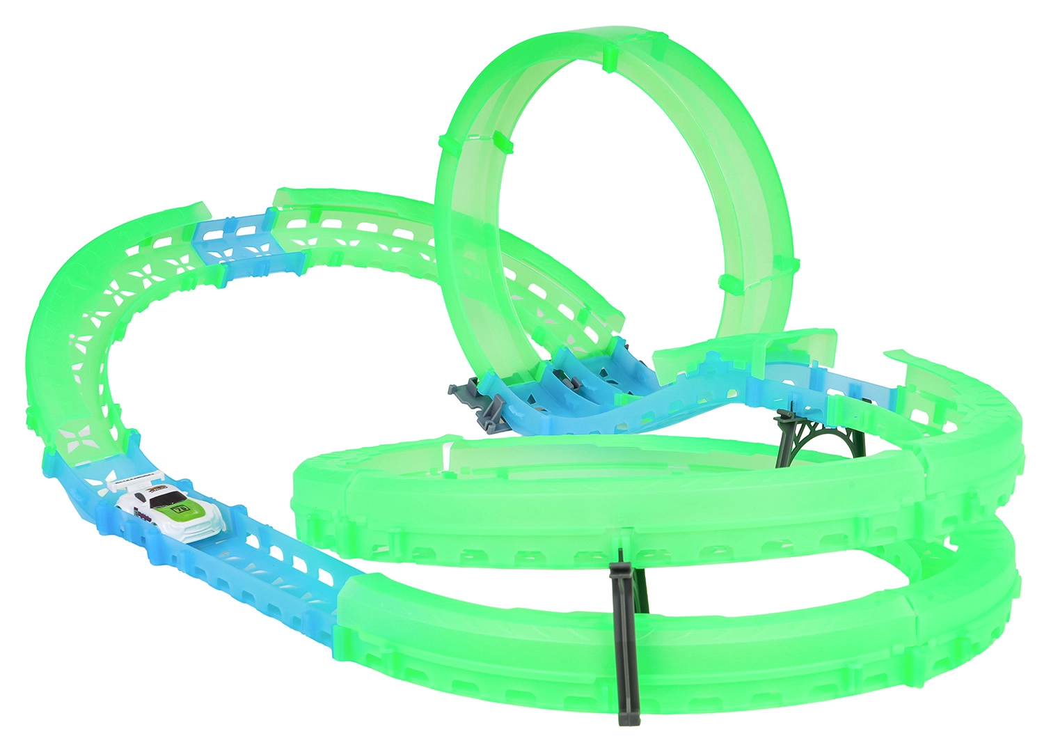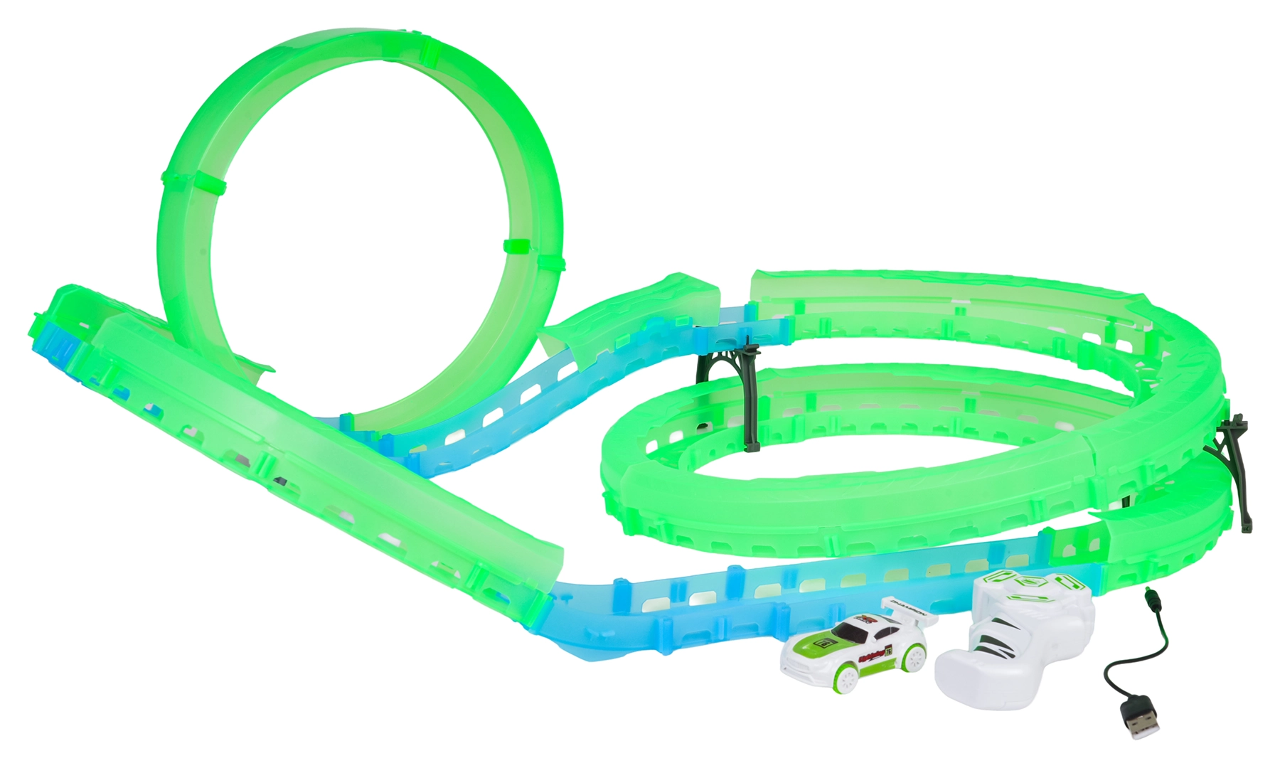 Ta velika svetleča dirkalna steza spremeni otroško sobo v akcijski krog. Fluorescentni deli po osvetlitvi lepo žarijo, avtomobilček z LED učinki pa med vožnjo ustvarja svetlobne sledi. Zaradi preprostega spajanja delov bodo otroci zlahka postavili svojo stezo in se takoj podali na dirko.