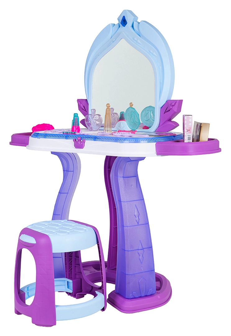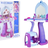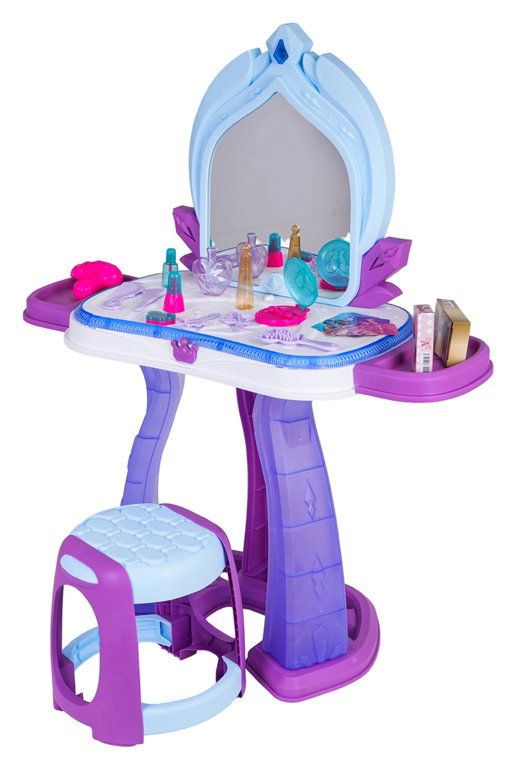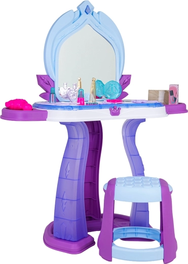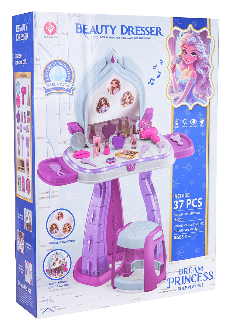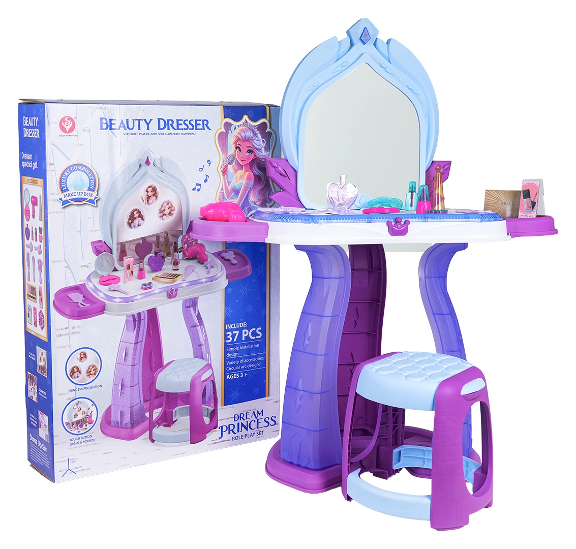 Ta čarobna otroška toaletna mizica združuje varno zasnovo z interaktivno zabavo. Okrog plošče sveti nežna osvetlitev, na zrcalu pa se prikazujejo podobe princesk, ki jih spremljajo vesele melodije. Zahvaljujoč bogatim dodatkom se lahko otroci preizkusijo v igri vlog ličenja, česanja in skrbi za videz.
