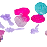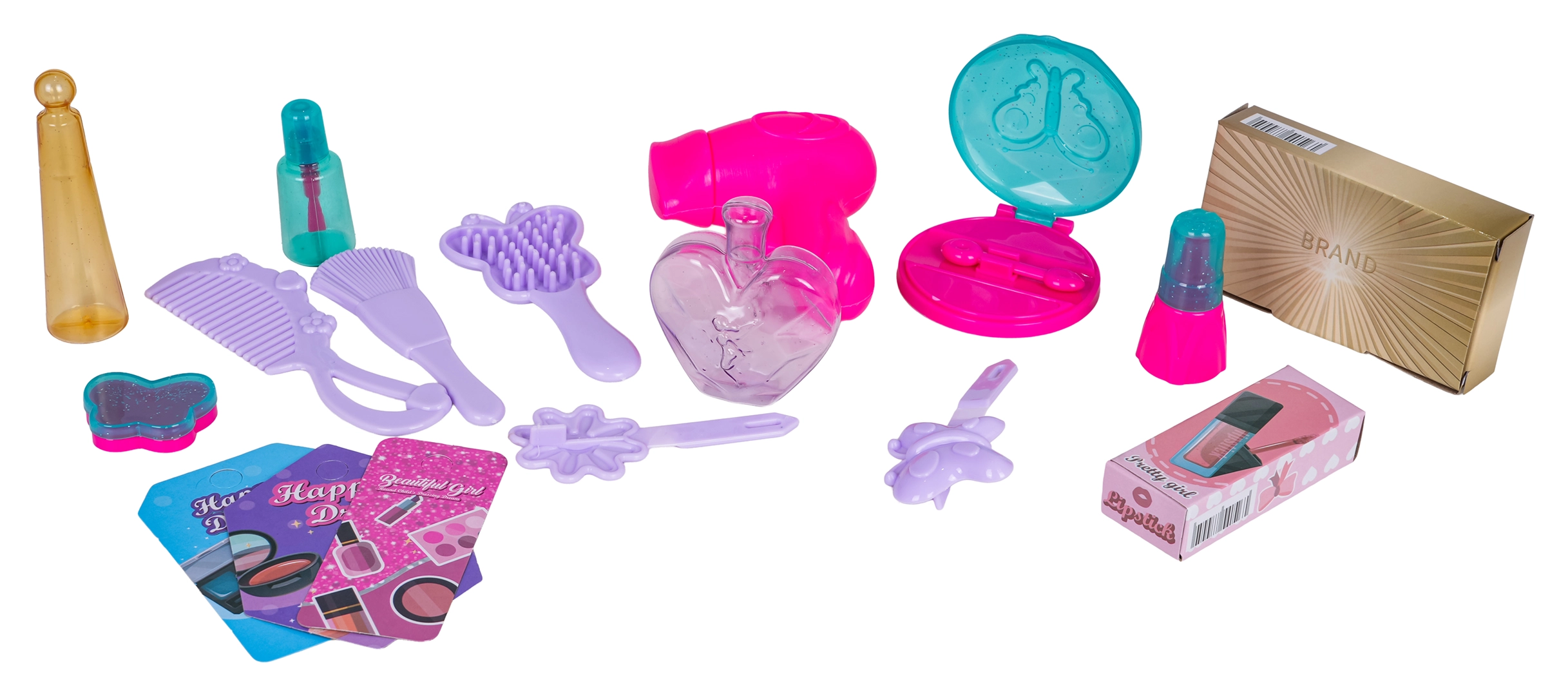Do 37 dodatkov: otroški sušilnik za lase, glavniček, krtača, sponke, čopiček, šminka, lak za nohte, »parfumi«, senčila in druge atrape kozmetike.