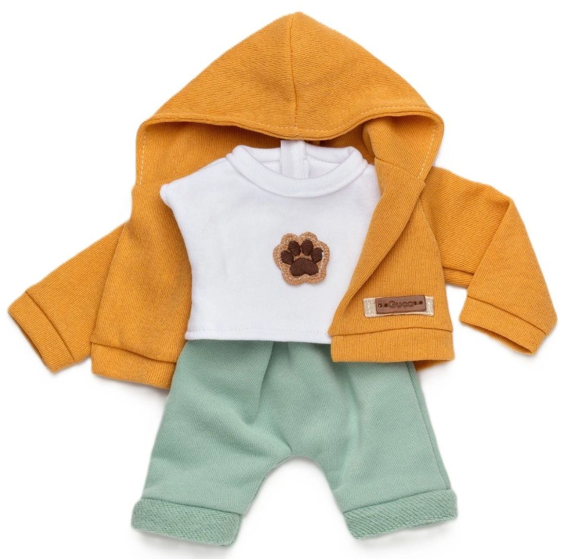 Podarite svoji opički Reborn velikosti 32 cm edinstven slog. Ta 3-delni komplet združuje udobje in ljubek dizajn: gorčični kapucar za toplino in stil, bela majica z našitkom tačke ter mint hlače z mehkimi manšetami za popolno prileganje. Oblačila so zasnovana za pogosto preoblačenje in enostavno vzdrževanje.