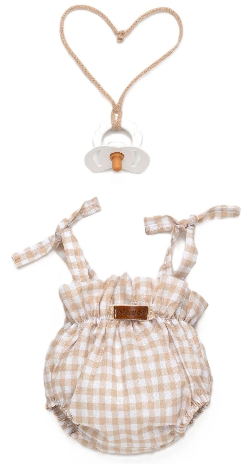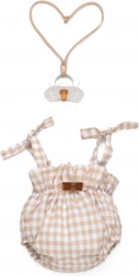 Bež-bela karirasta romper obleka z vezalkami na naramnicah, elastičnimi hlačnicami in nabranim pasom varno pristaja lutki in izgleda odlično na fotografijah.