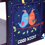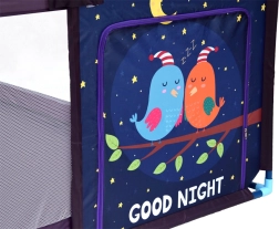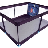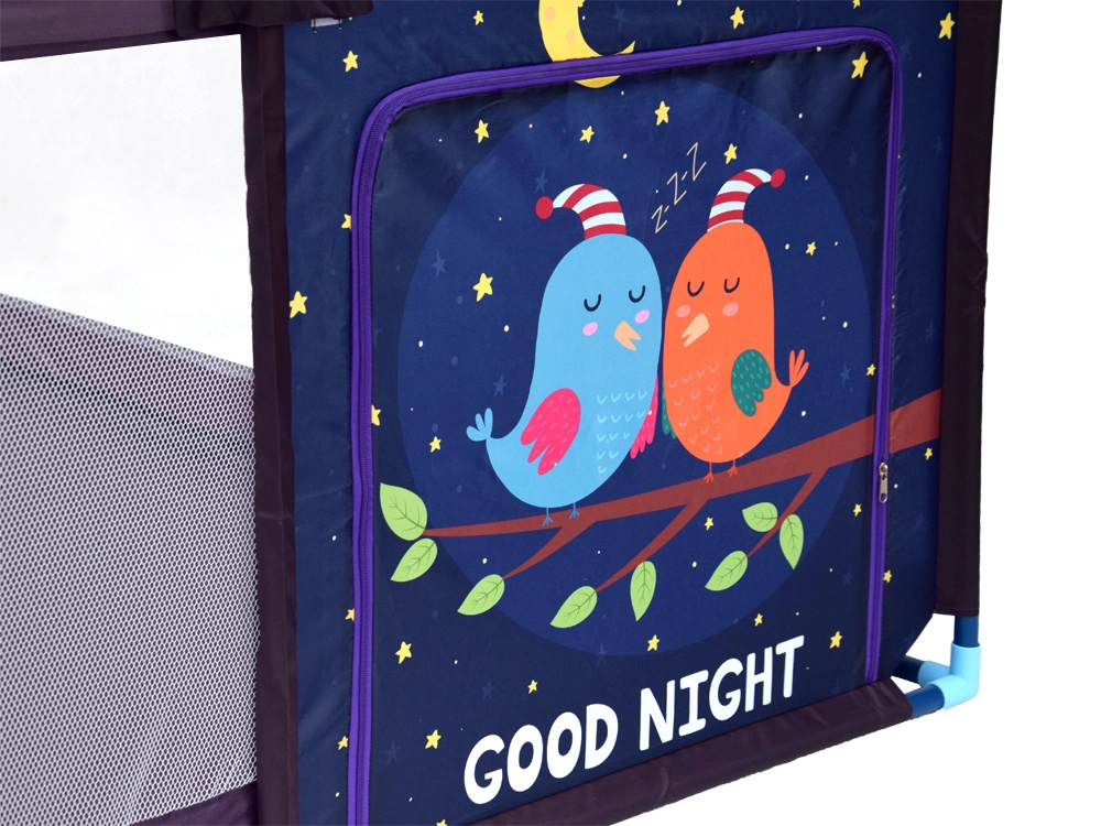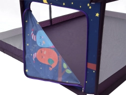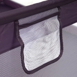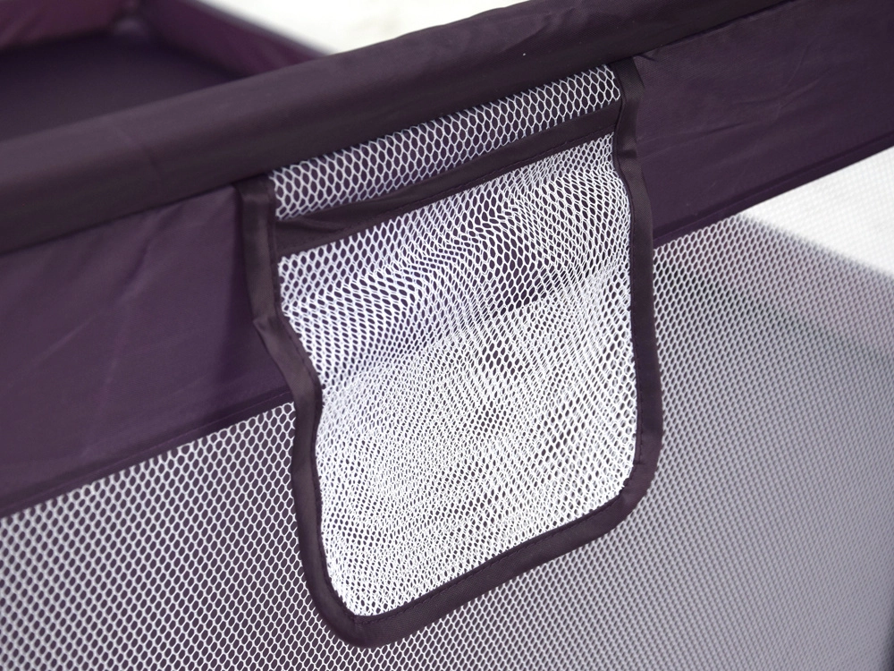 Praktičen vhod z zadrgo zagotavlja varen in nadzorovan izhod. V stranskih stenah sta 2 majhna žepa za drobnarije. Material je preprosto čistljiv (ročno pranje), zato ograjo zlahka ohranite čisto. Nevsiljiva vijolična izvedba z ljubkim motivom se poda v vsako otroško sobo.