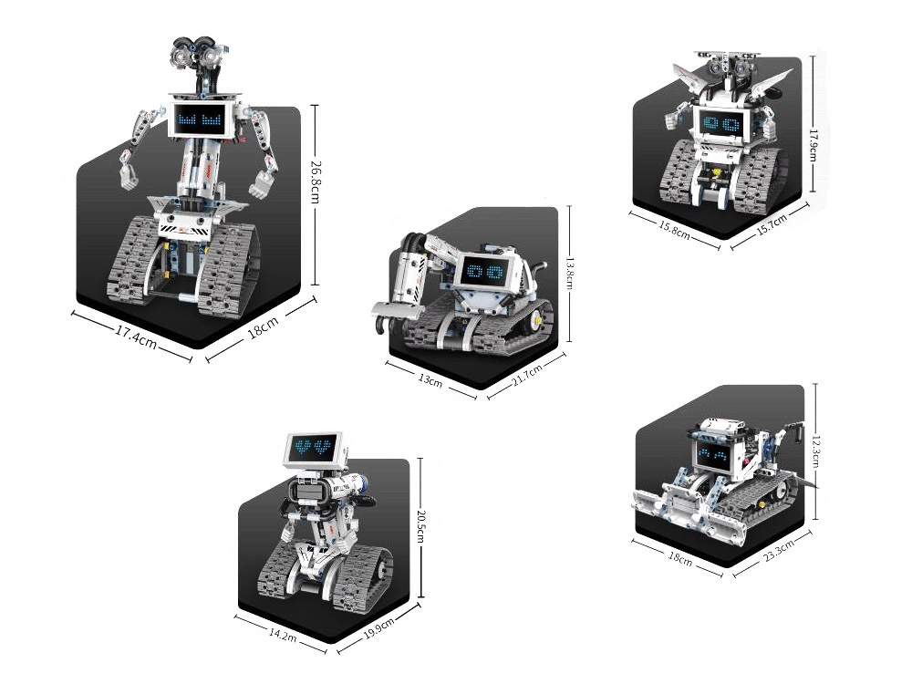 Ta sodoben komplet prinaša vse, kar otroci potrebujejo, da iz enega nabora delov zgradijo in upravljajo pet različnih robotskih modelov. Zahvaljujoč daljinskemu upravljalniku, pogonu na gosenicah in izrazitemu zaslonu »obraza« bodo mali inženirji uživali ure zabave in učenja.