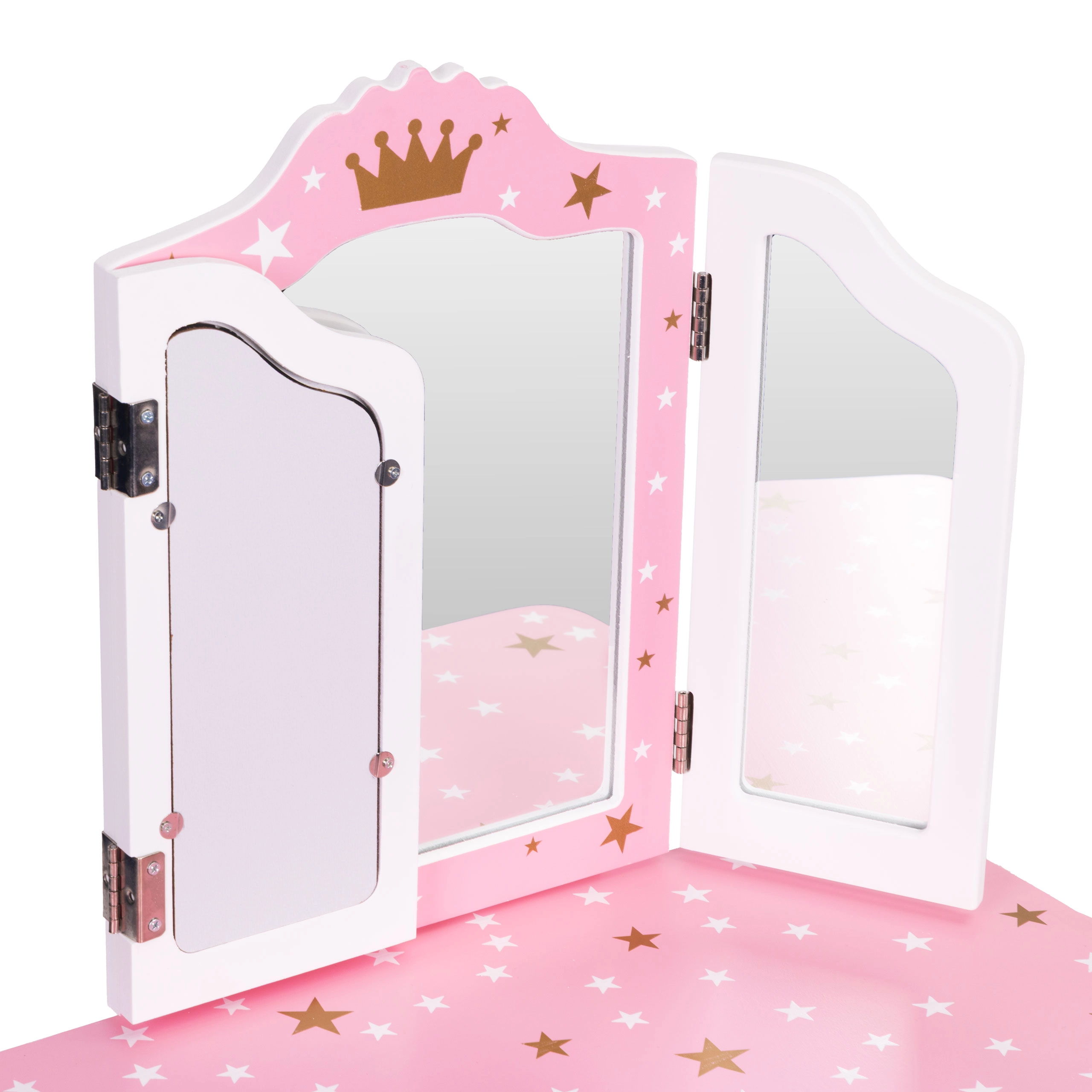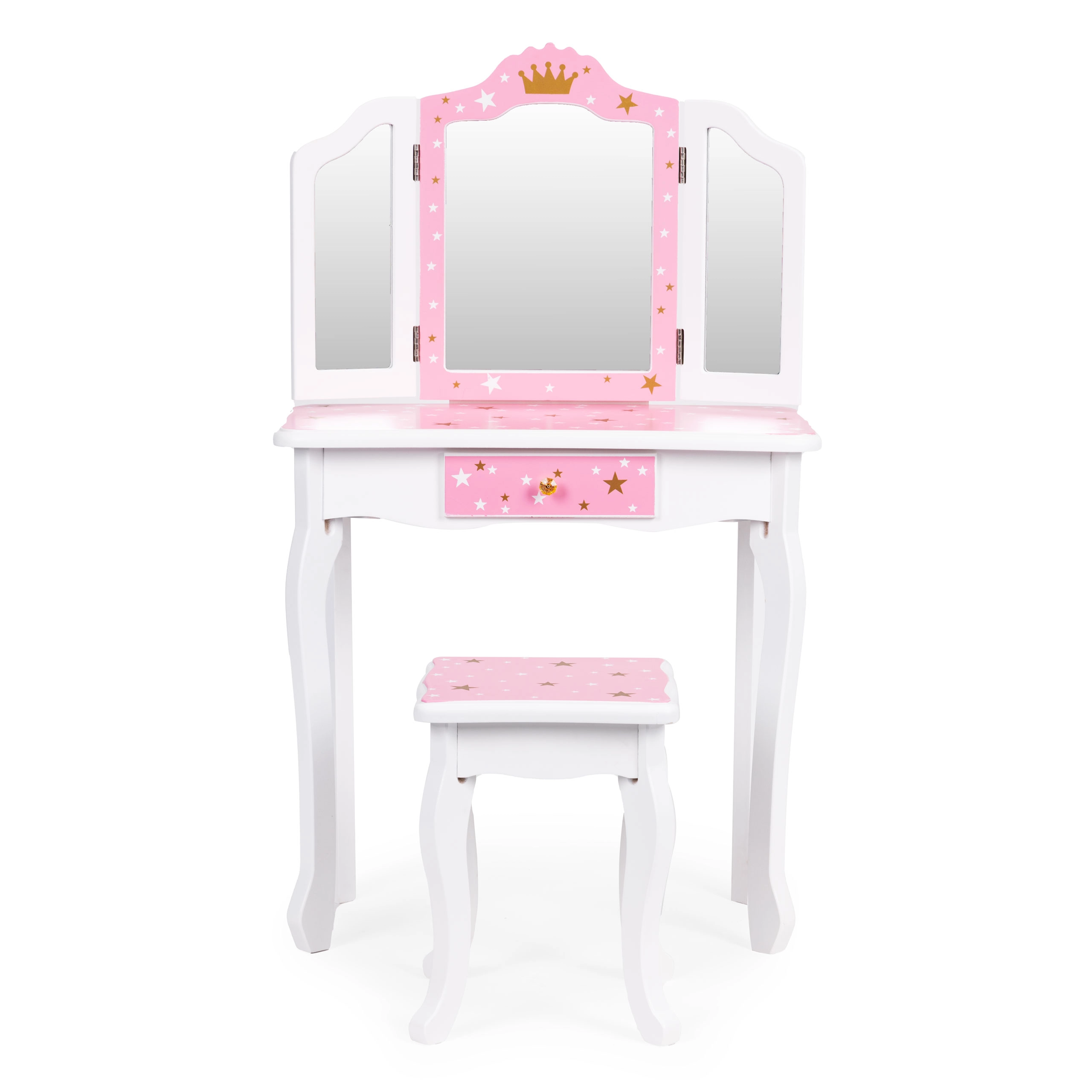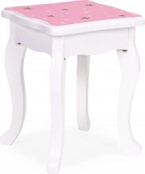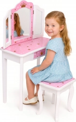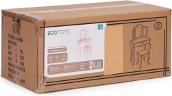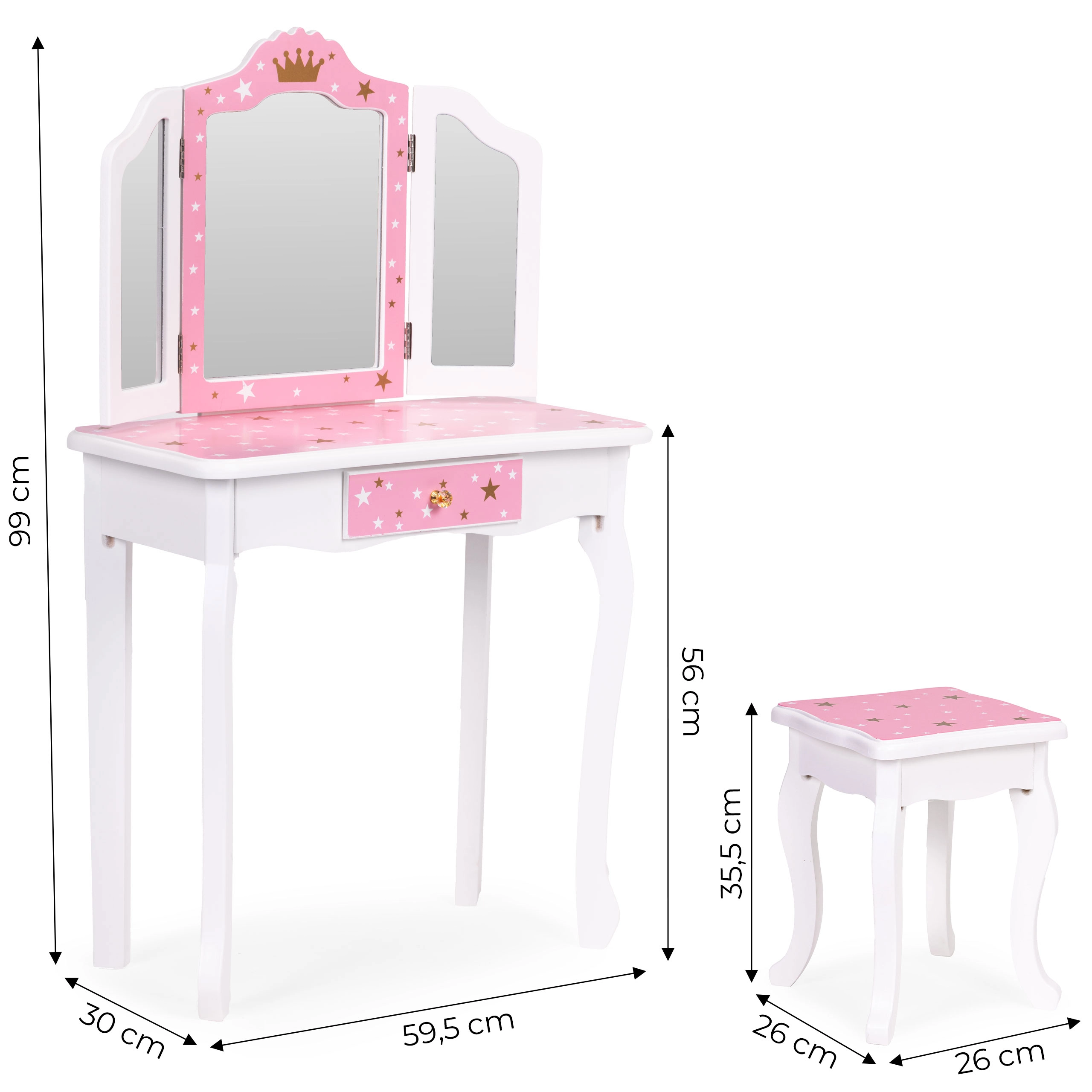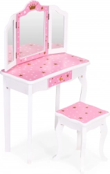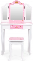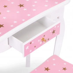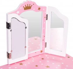 Ustvarite v otroški sobi čaroben kotiček lepote. Toaletna mizica ECOTOYS združuje funkcionalnost in pravljični dizajn: veliko sredinsko ogledalo dopolnjujeta dve stranski zložljivi krilci za pogled iz različnih kotov, medtem ko praktičen predal skrije sponke, elastike in otroške dodatke. Komplet dopolnjuje stabilen stolček, usklajen z dizajnom.