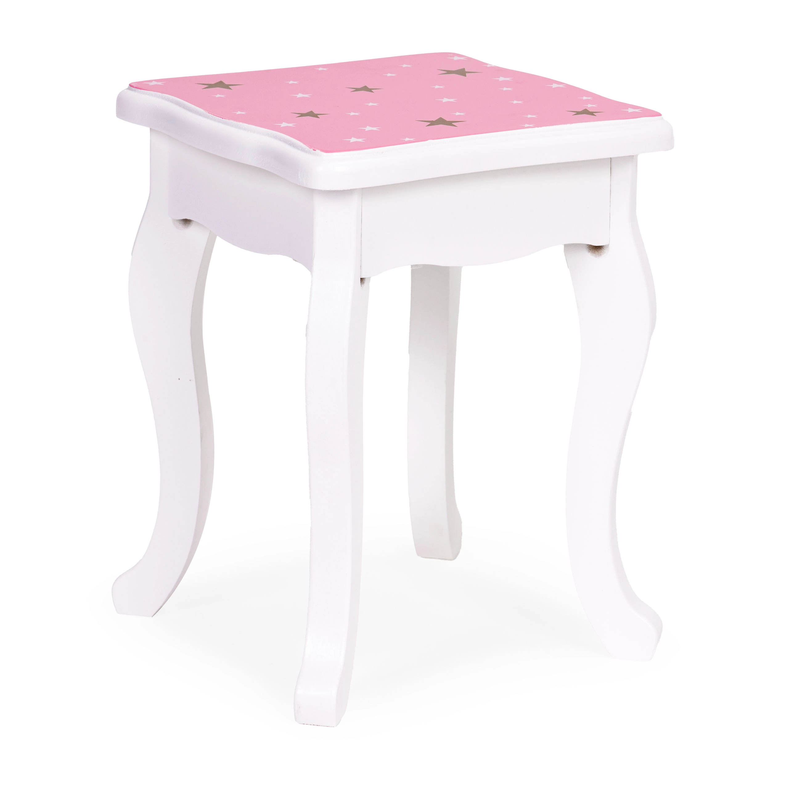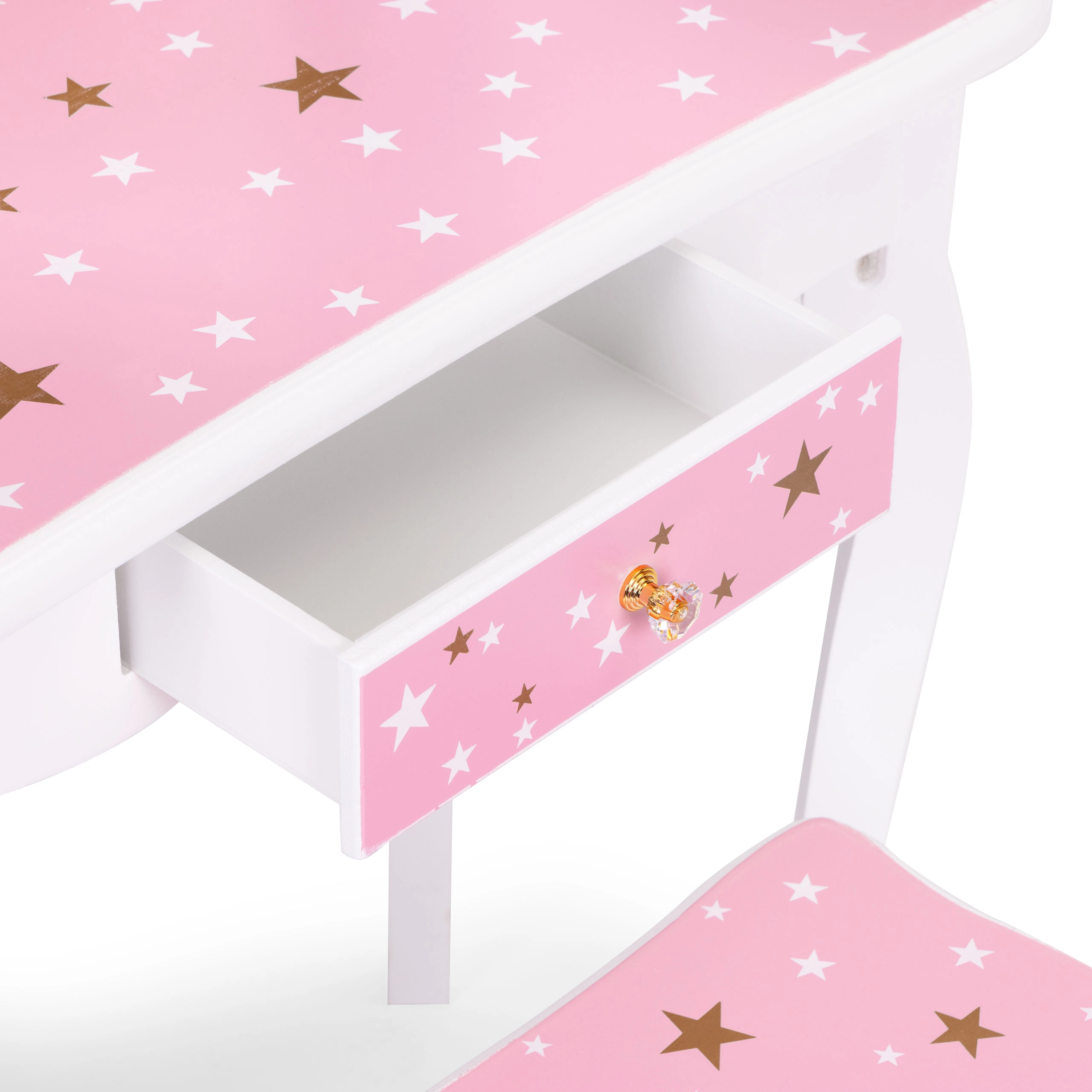 Zahvaljujoč kakovostnemu lesu in MDF je mizica čvrsta in trpežna. Spodbuja fino motoriko, oko‑roka koordinacijo in samostojnost pri vsakodnevni igri “lepotni salon” ali “princeza”. Nežna rožnata z motivi zvezdic in kronice se poda v večino interierjev.