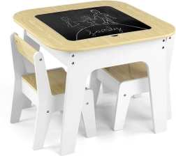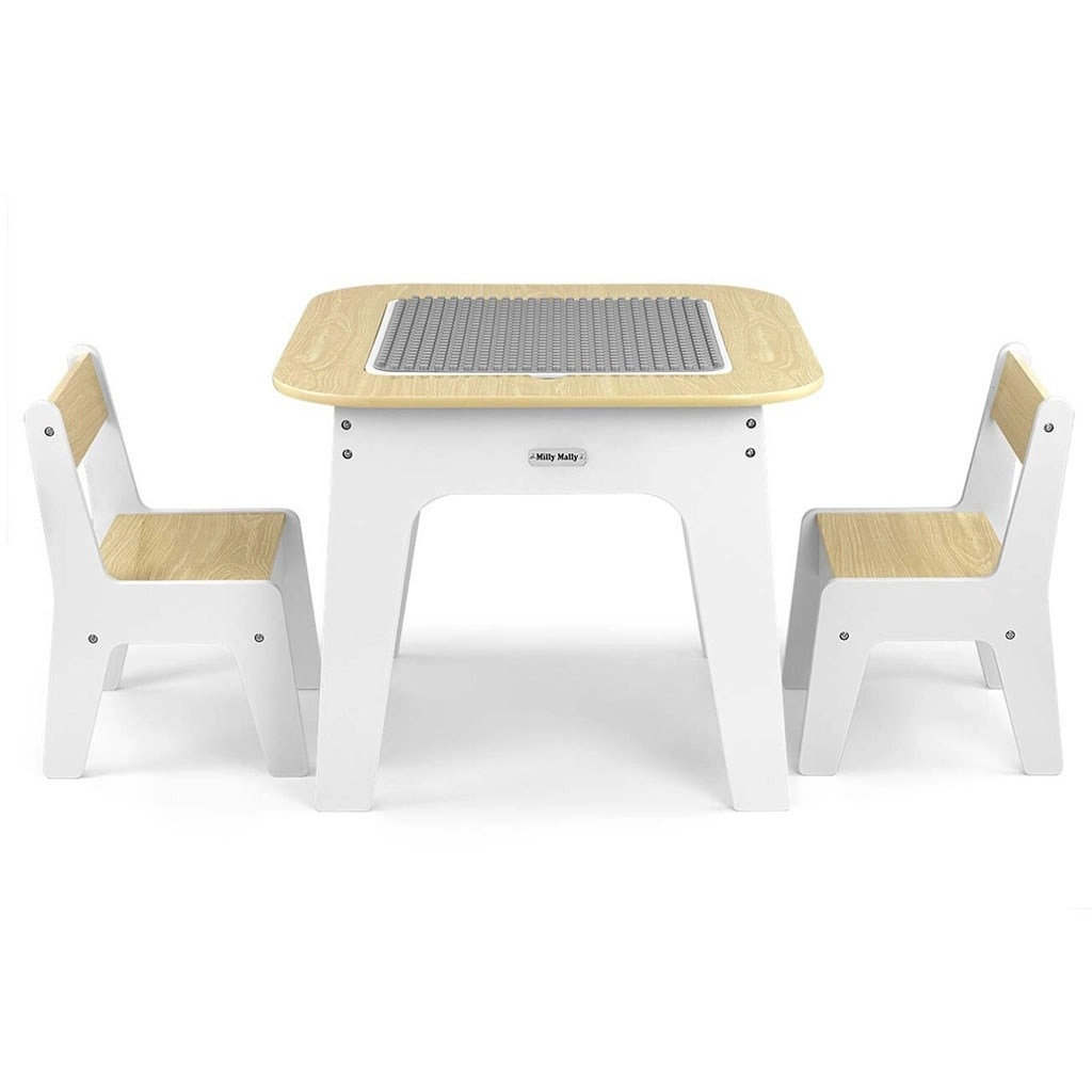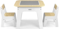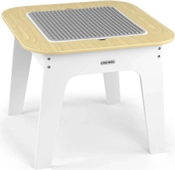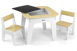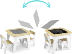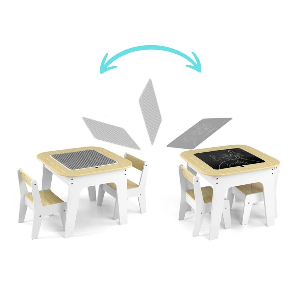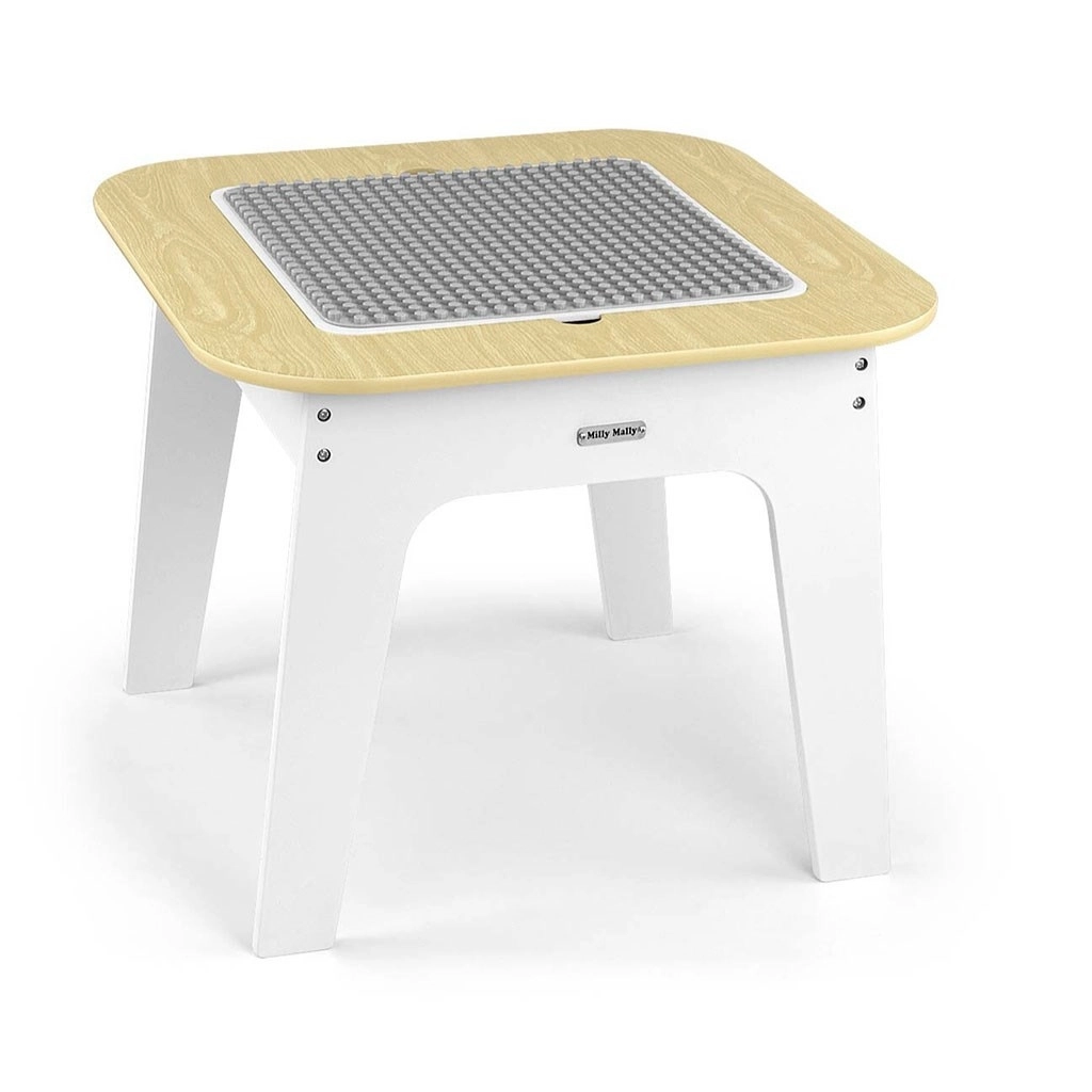 Komplet Olaf Blocks ustvarja ustvarjalni prostor za igro in učenje. Ena stran mizne plošče je prilagojena za gradnjo iz kock, druga je gladka za risanje, pisanje in ustvarjanje (možno risanje s kredo). Odstranljiva plošča skriva prostoren zaboj za igrače in likovni material, tako da je vse pri roki in hkrati pospravljeno.