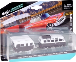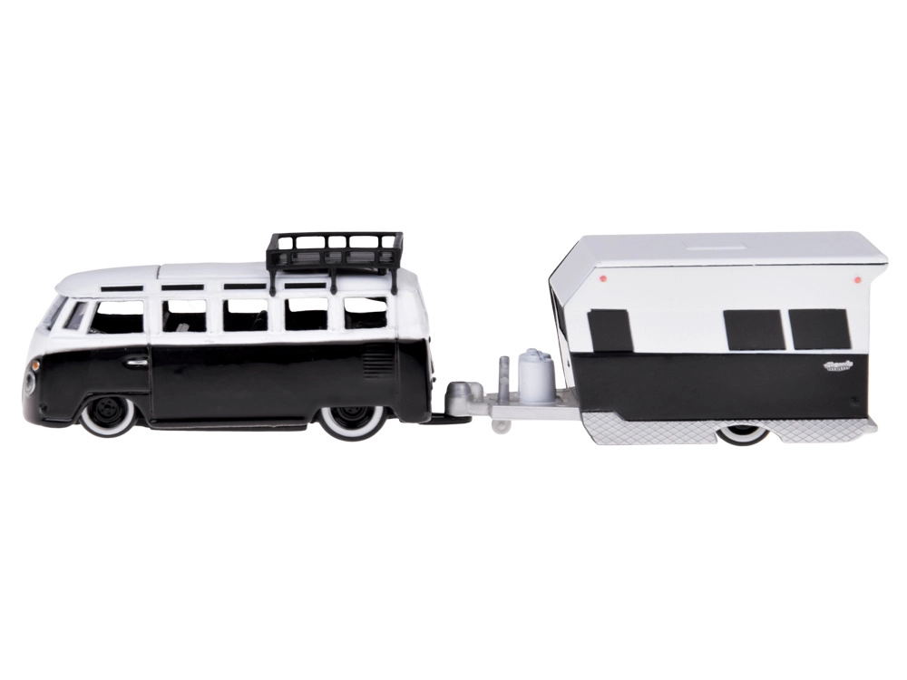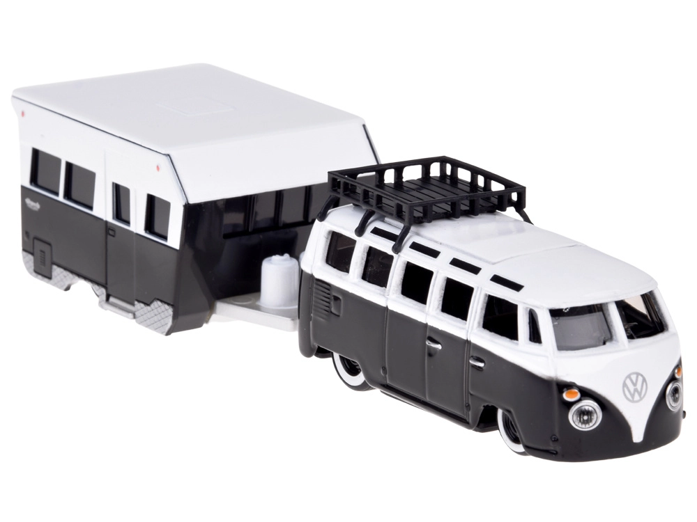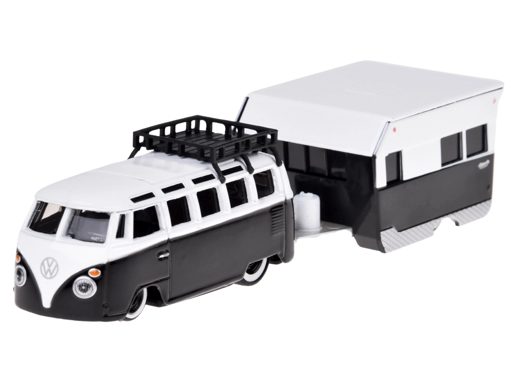 Stilski zbirateljski set v merilu 1:64 združuje ikonični VOLKSWAGEN Van Samba in realistično počitniško prikolico. Kovinska karoserija, podrobna izdelava in odstranljiva prikolica zagotavljajo odličen videz na polici in zabavno igro. Črno‑bela kombinacija, funkcionalna vlečna kljuka in verodostojni detajli ga naredijo za popolno darilo za zbiratelje in ljubitelje klasičnih vozil.