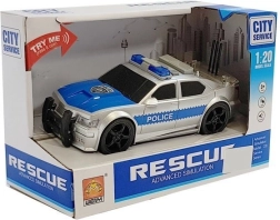 Srebrn policijski avto v merilu 1:20 bo navdušil male ljubitelje akcije. Zahvaljujoč svetlobnim in zvočnim učinkom, trem gumbom na strehi in vztrajniku bodo otroci uživali v realistični igri posredovanja. V pakiranju so priložene baterije, ne manjka niti odpirajoč se zadnji prtljažnik in varnostna certifikacija CE.