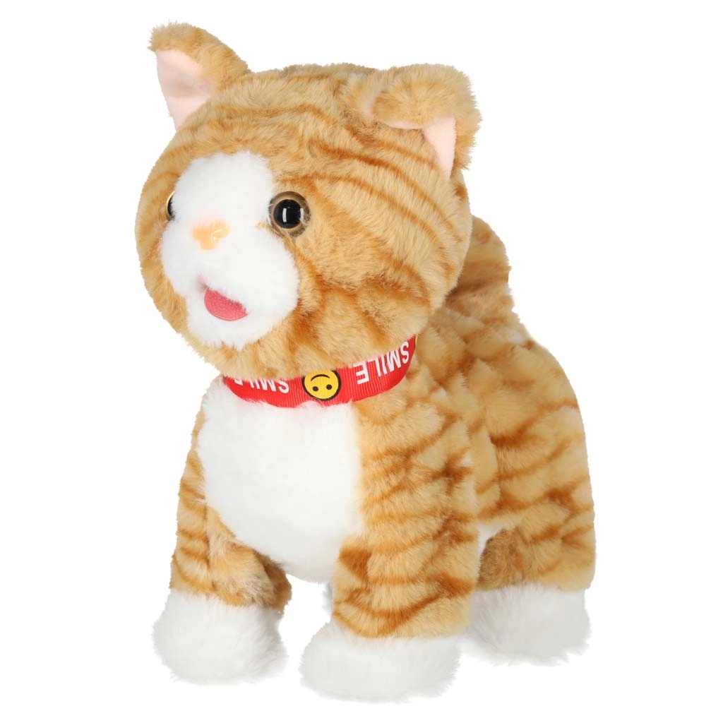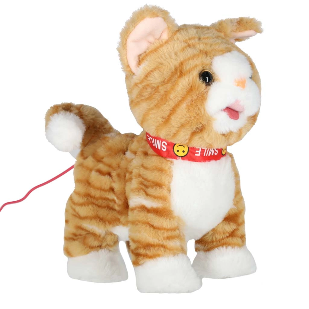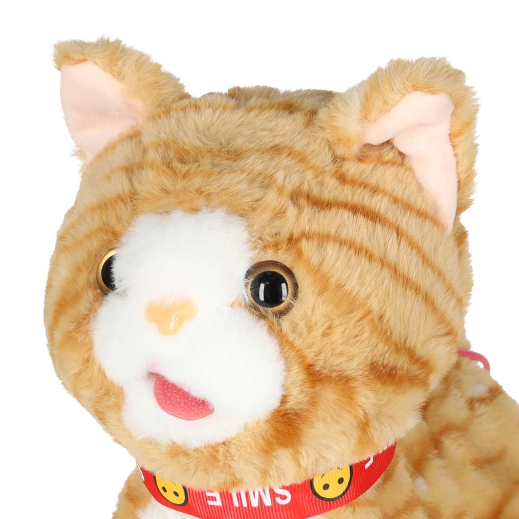 Po božanju mucka mijavka ter premika glavico in jeziček, med hojo pa dodatno maha z repom za še bolj realističen nastop.