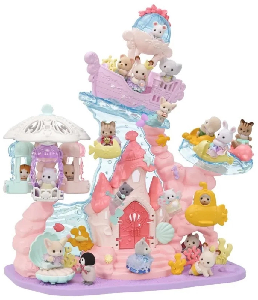 Odkrijte čarobno podmorsko palačo SYLVANIAN FAMILIES, ki bo otroško sobo spremenila v kraljestvo domišljije. Set ponuja žičnico, ki se vozi gor in dol, vrtiljak z morskimi bitji, vožnjo v podmornici in na rumeni ribici. Vključuje tri žametne figurice otrok z gibljivimi sklepi, skrinjo z zakladom, odpirajoča se vrata in posteljo v obliki školjke – idealno za kreativno igro in razvoj fine motorike otrok od 3 let.
