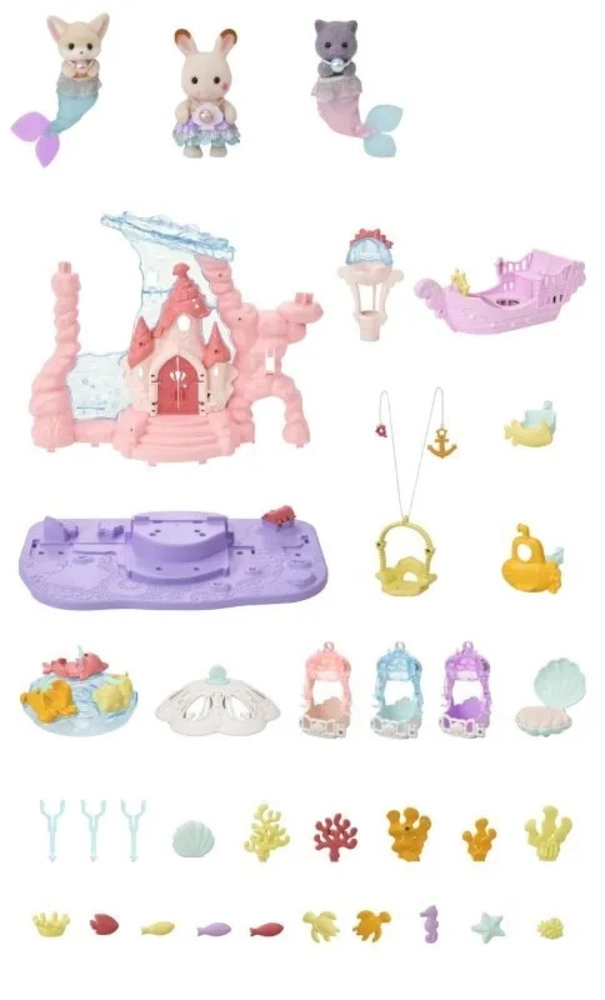 Vstopite v svet čarovnije s podmorsko palačo, polno interaktivnih funkcij. Otroci lahko svoje figurice vozijo z žičnico, zavrtijo vrtiljak z meduzami in morskimi bitji, plujejo v podmornici ali se zapeljejo na prisrčni rumeni ribici. Bogate podrobnosti, prosojni elementi in pastelne barve ustvarjajo očarljivo sceno za neskončne zgodbe.