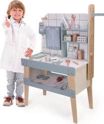 Ta igra vlog podpira domišljijo, družbeno interakcijo in pomaga zmanjšati strah pred obiskom zdravnika. Realistični pripomočki iz kakovostnega lesa in drugih materialov učijo otroke prepoznavati zdravniška orodja, načrtovati preglede in skrbeti za “paciente”.