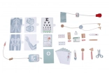 Stetoskop, tlakomér, termometer, otoskop, injekcijska brizga, kladivce, škarje, pinceta, infuzija, kartice pacienta, očesna tabla, kartončki z zdravili in drugi dodatki za popolno igro.