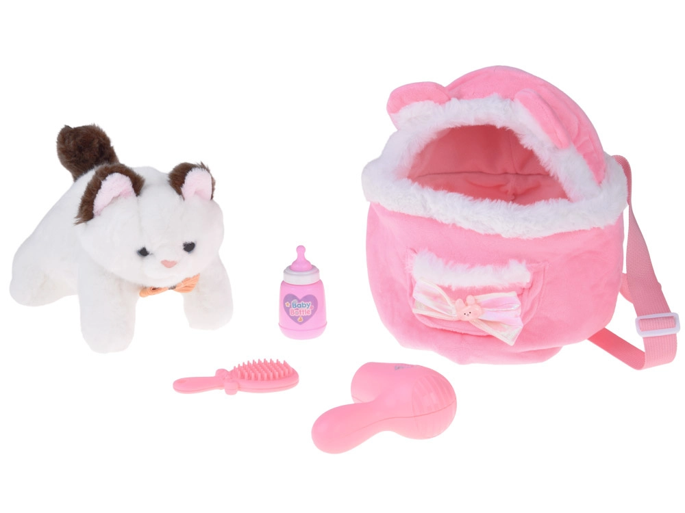 Prisrčen set za male skrbnike: mehki beli maček z rjavimi ušeski in pentljo, rožnati plišasti nahrbtnik ter dodatki za nego. Maček ima upogljive tačke za enostavno postavljanje v različne položaje, v trebuščku pa modul z učinkom utripa srca za še bolj realistično igro. V kompletu najdete tudi stekleničko, glavniček/čopič in sušilec za lase. Nahrbtnik ima nastavljive naramnice in praktičen žepek za drobnarije.