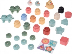 Ta vsestranski izobraževalni komplet združuje gradnjo, razvrščanje in spodbudno senzorično igro. Mehke, stisljive kocke z varno zaobljenimi robovi dobro ležijo v roki, so prijazne do dlesni, nekateri elementi pa ob stisku nežno zapiskajo – to prebuja otroško radovednost in podaljšuje osredotočeno igro.