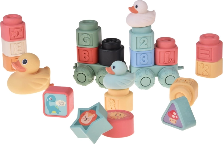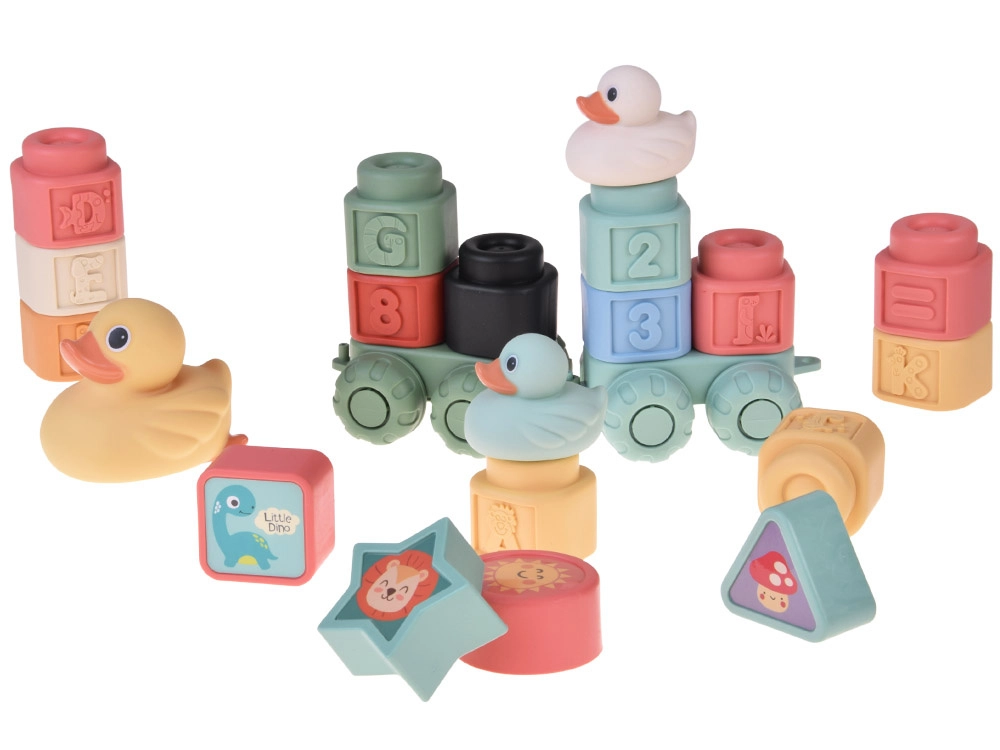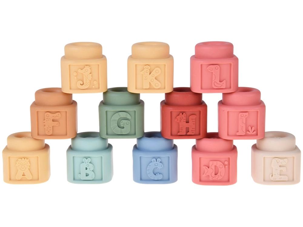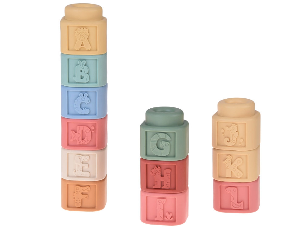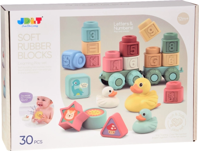 Zabaven in varen komplet za najmlajše: mehke pastelne kocke z reliefnimi črkami, številkami in živalicami, dopolnjene s prikupnimi kopalnimi račkami. Elastičen in netoksičen silikon/guma je prijeten na dotik, primeren za majhne rokice in kot grizalo. Spodbuja fino motoriko, koordinacijo roka–oko, učenje barv, oblik in števil ter ponuja veliko ustvarjalne zabave doma in v vodi.