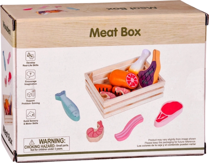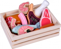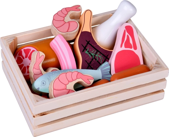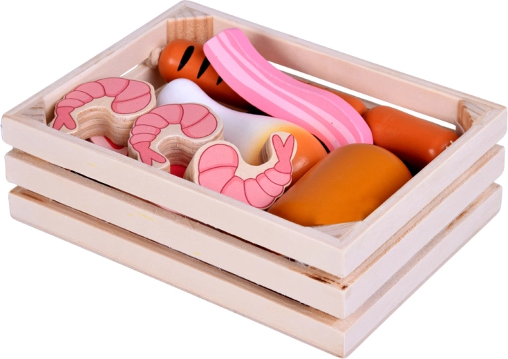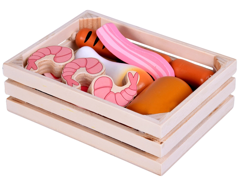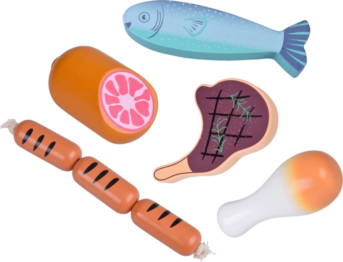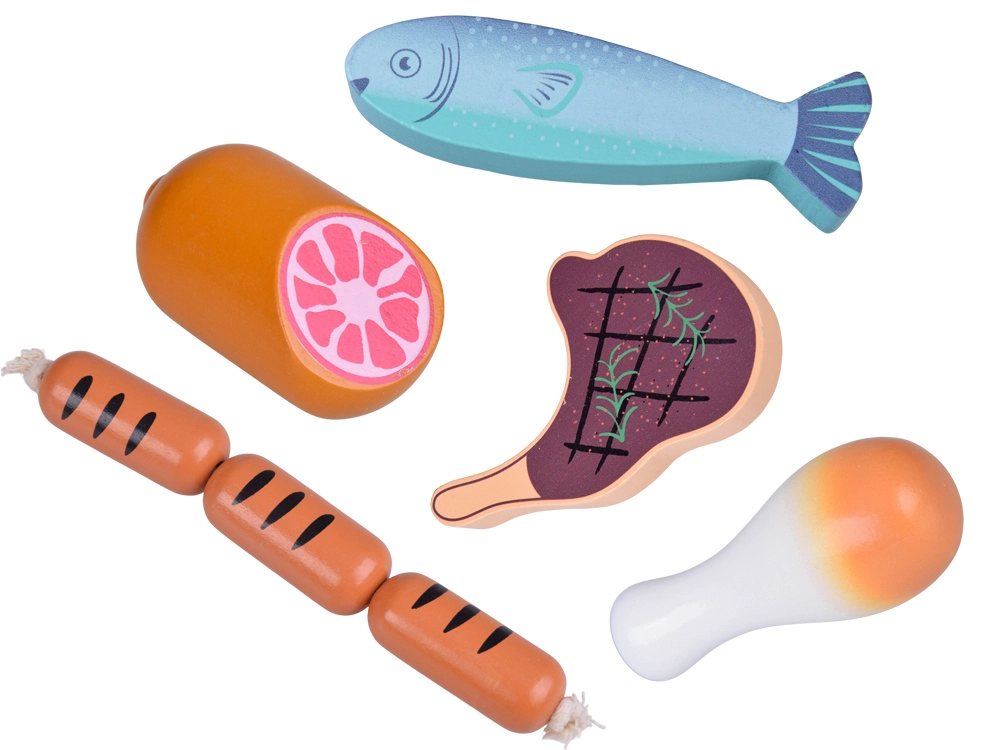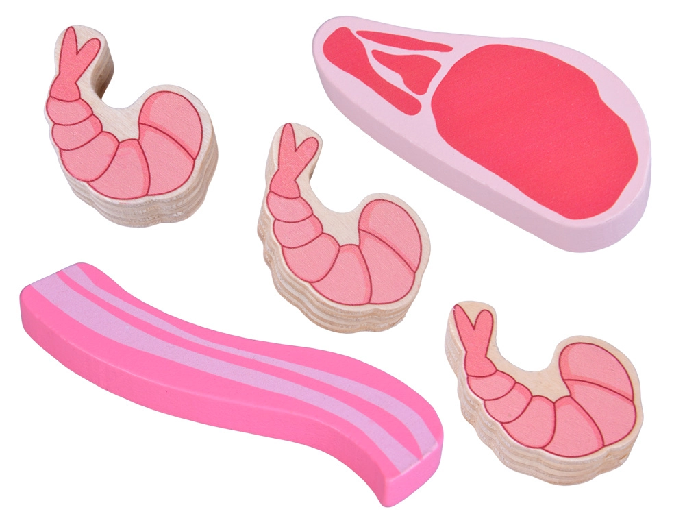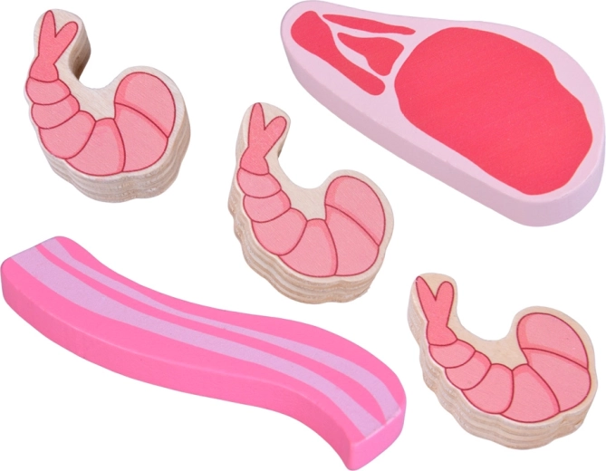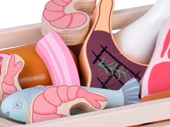 Ta leseni komplet živil vsebuje vse, kar otroci poznajo iz kuhinje ali trgovine: hrenovke, salamo, slanino, bifteke, piščančje kose, ribo in kozice. Deli so čvrsti, prijetno zaobljeni in podrobno poslikani, da delujejo realistično, hkrati pa so povsem varni za igro.