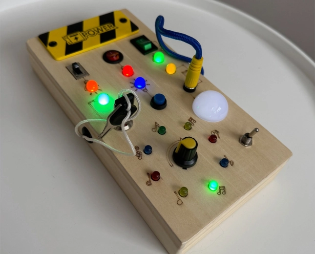 Ta lesena montessori aktivna plošča združuje praktično učenje in senzorično igro. Otroci priključujejo kabel, pritiskajo gumbe, preklapljajo stikala in opazujejo, kako barvne LED reagirajo – tako si naravno osvajajo vzrok–posledico ter vadijo fino motoriko in koordinacijo oko–roka.