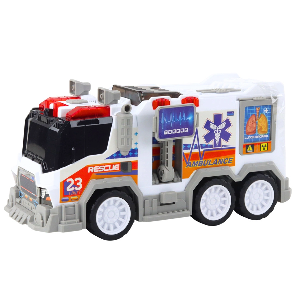 Ta podrobno izdelana reševalna vozila navduši z priljubljeno belo‑rdečo barvno kombinacijo z modrimi elementi in izrazitimi medicinskimi potiski. Ob pritisku na gumbe se aktivirajo sirene in svetlobni učinki, ki akcijskim reševalnim scenarijem dodajo pristnost.