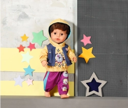 Privoščite svoji punčki moderen ulični videz. Set vsebuje rumeni pulover s kapuco 2v1 s prišitim brezrokavnikom v jeans videzu ter udobne trenirke v izraziti barvi robid. Zabavni živalski potiski in zvezde oblačilom dodajo igriv pridih ter navdihujejo k ustvarjalnim zgodbam in dolgi igri.