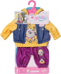 Slogovna ulična oblačila BABY born za punčke 43 cm prinašajo pulover s kapuco 2v1 z brezrokavnikom v jeans videzu in udobne trenirke v barvi robid. Veseli potiski živalic in zvezd podpirajo domišljijo in dolgotrajno igro, oblačenje pa je preprosto zaradi kakovostne izdelave, v pakiranju pa najdete tudi praktičen obešalnik.