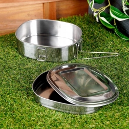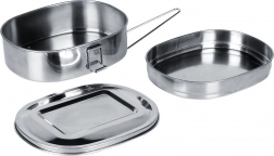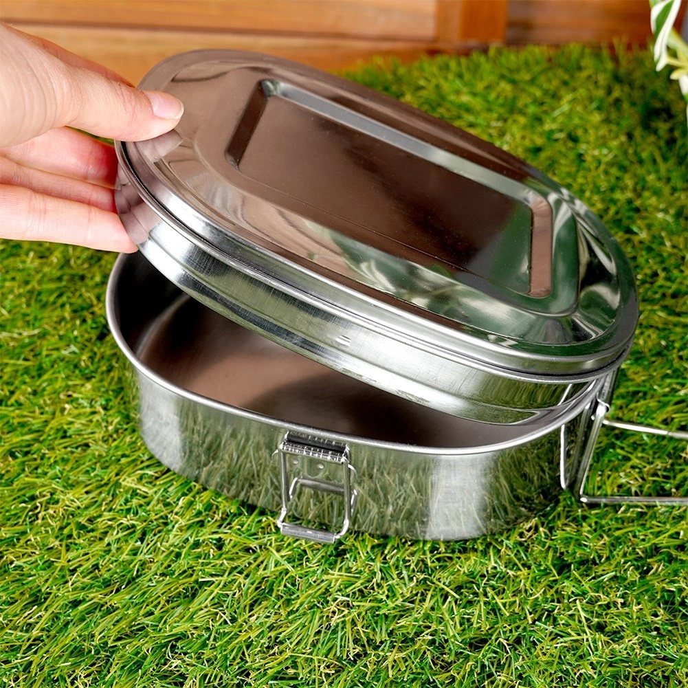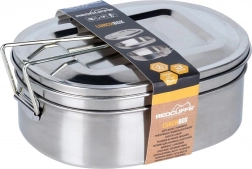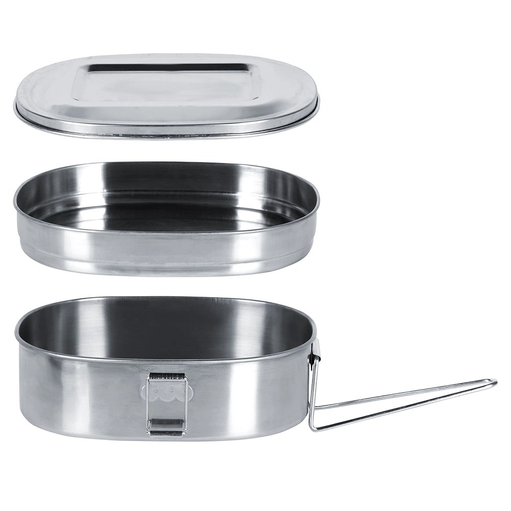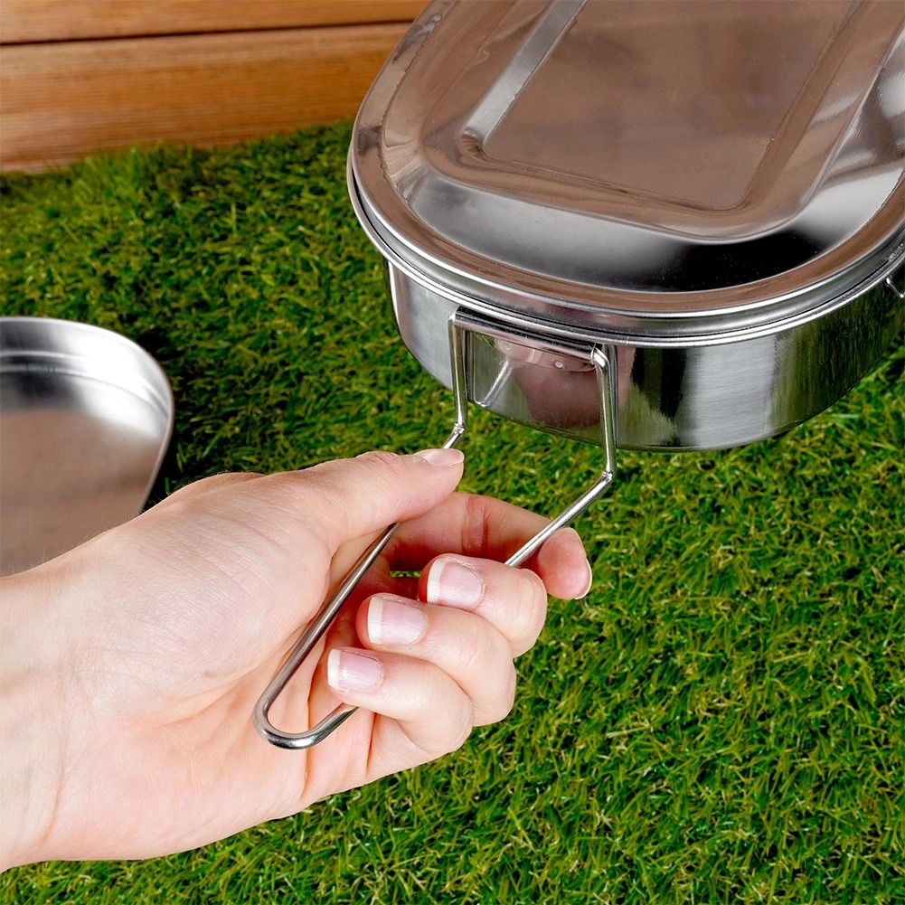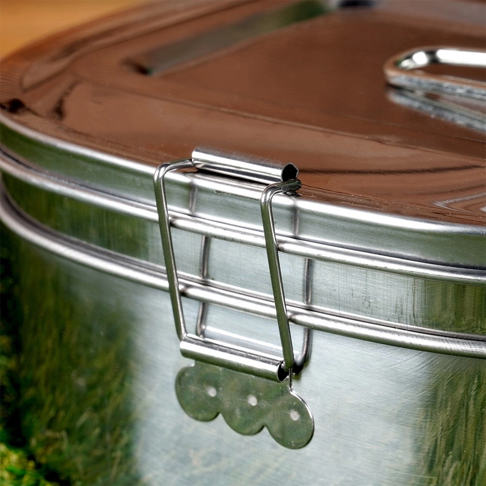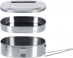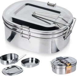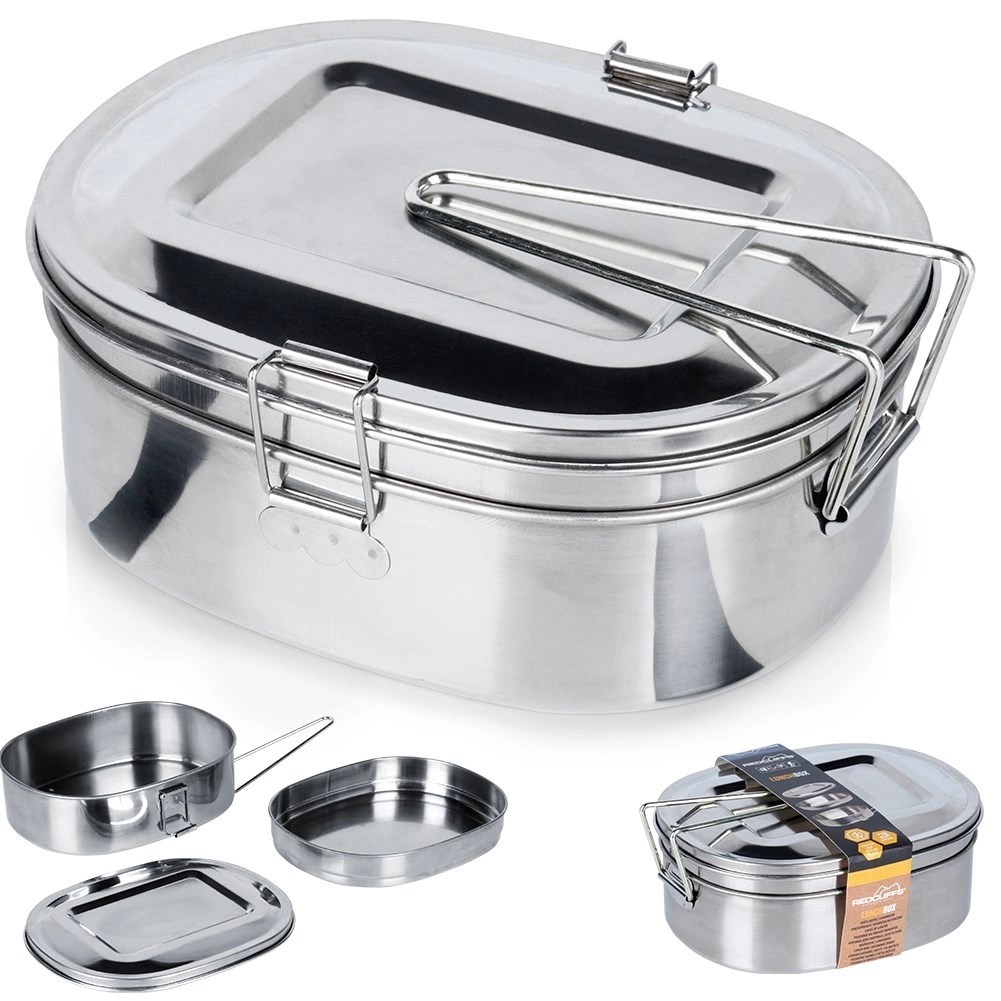 Ta kompaktni set iz kakovostnega nerjavečega jekla je odlična rešitev za vsakodnevna kosila in outdoor avanture. Glavna posoda s prostornino 900 ml sprejme nasitno glavno jed, manjši vložek 350 ml je idealen za priloge, prigrizke ali sladice. Po zapiranju tvori stabilno celoto z zanesljivimi sponkami in preklopnim ročajem za enostavno prenašanje.