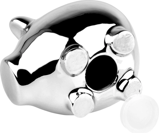 Elegantna hranilnica v obliki pujse s bleščeče srebrno zrcalno površino iz keramike. Praktičen spodnji odstranljiv zamašek omogoča dvig prihrankov brez razbijanja. Kompaktne dimenzije 11,5 × 9 × 9 cm in sodoben videz naredijo hranilnico za stilski dekorativni dodatek ter odlično darilo za otroke in odrasle.