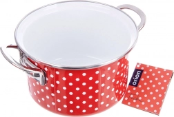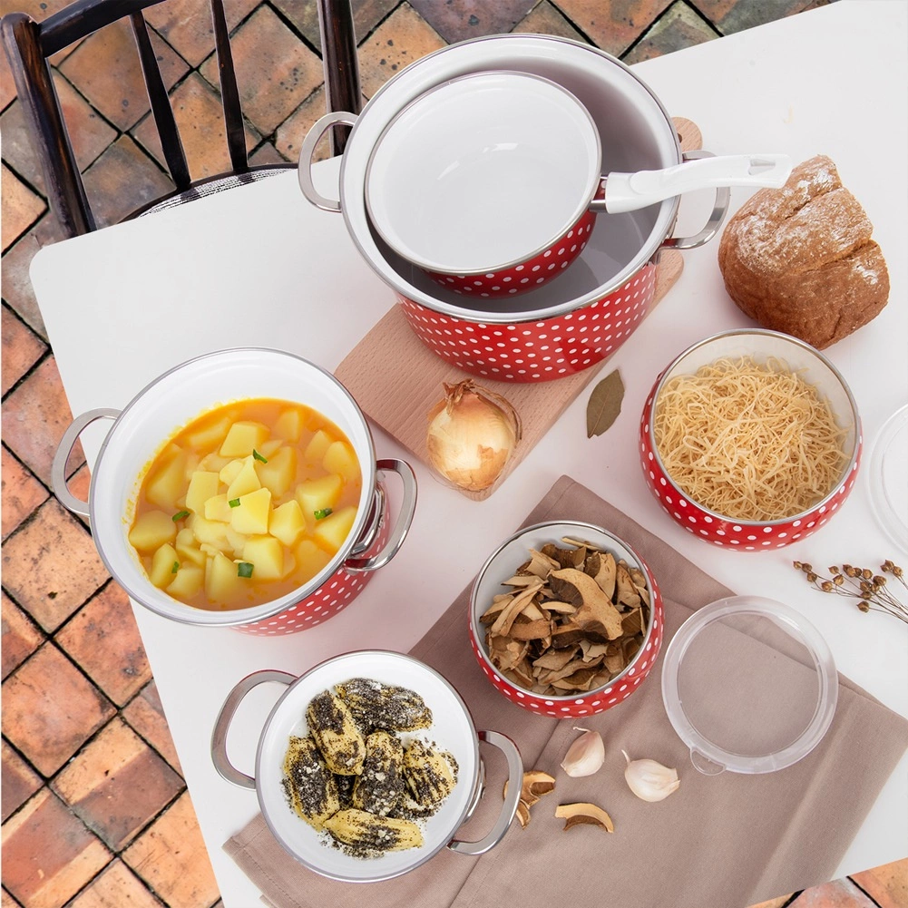 Priljubljen emajliran lonec v rdeči barvi z belimi pikami vnese v kuhinjo pridih retro sloga in hkrati ponuja praktične lastnosti za vsakodnevno kuhanje. Čvrsto telo iz emajliranega jekla zagotavlja enakomeren prenos toplote in dolgo življenjsko dobo, nerjavni rob ter robustna stranska ročaja pa poskrbita za varno rokovanje.