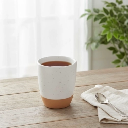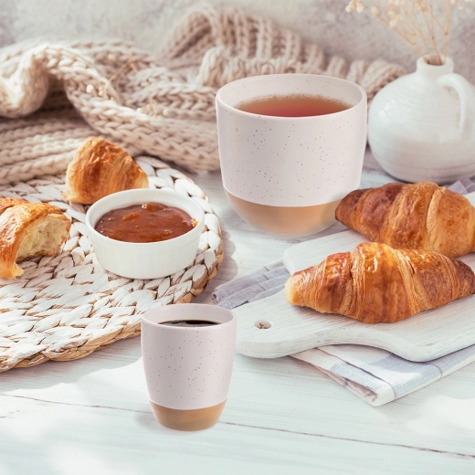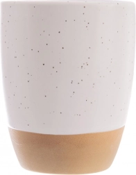Uživajte v svojem najljubšem espressu s stilom. Ta majhna skodelica s prostornino 90 ml ima brezčasen minimalističen videz: zgornji del z nežno pikčasto belo glazuro se harmonično preliva v naravno, neglazirano kamenino. Debelejše stene bolje zadržujejo temperaturo napitka, udobna oblika pa odlično leži v roki.