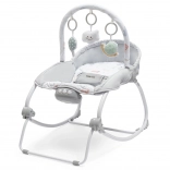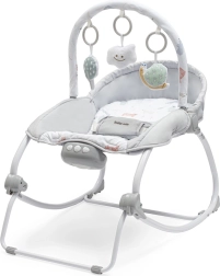 Praktičen in udoben 2-v-1 ležalnik za dojenčke od rojstva. Ponuja guganje z blokado, vibracije, melodije in svetlobne učinke za pomiritev in zabavo. Zahvaljujoč nastavljivemu naslonjalu, odstranljivemu lokU z igračami in tritočkovnim pasom je varen in udoben. Kot ležalnik je primeren do 9 kg, kot stolček do 18 kg.