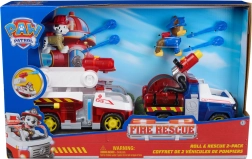 Podajte se na reševalno misijo s Chaseom in Marshallom! Vsaka figurica meri približno 6–7 cm, ima premično glavo in sedi v svojem vozilu, pripravljenem na akcijo. Modro reševalno vozilo za Chasea in rdeče-belo gasilsko vozilo za Marshalla sta opremljena z izstrelki »voda« ter strešnimi/žlebnimi topovi za realistično igro.