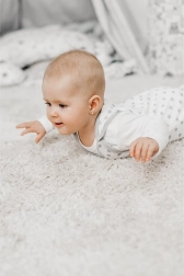 Praktično zapiranje na pritiskače na ramenih in v razkoraku olajša vsakodnevno preoblačenje in previjanje. Pajac je idealen za domače udobje in miren spanec dojenčka.