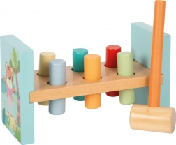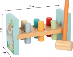 Ta robustna lesena zabijalna klop z veselimi motivi džungle ponuja otrokom od 1. leta varno in smiselno zabavo. Gumirane odprtine držijo valjčke trdno na mestu in hkrati ublažijo udarce, kar otrokom pomaga uriti moč prijema in natančnost. Ko so vsi valjčki zabiti, klop preprosto obrnite in zabava se začne znova.