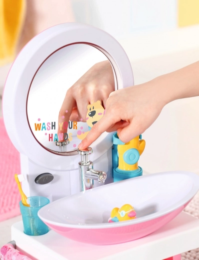 Otroke učite pravilnih higienskih navad skozi igro. Belo-rožnati umivalnik za punčko BABY born ponuja svetlobne in zvočne učinke, pravi curek vode ob pritisku na pipo ter ljubke dodatke za popolno nego. Ko se ogledalo osvetli, zazveni melodija, ki služi kot igrivi časovnik za umivanje rok.