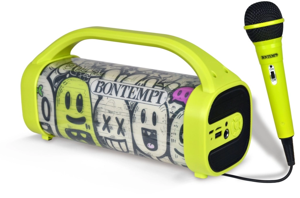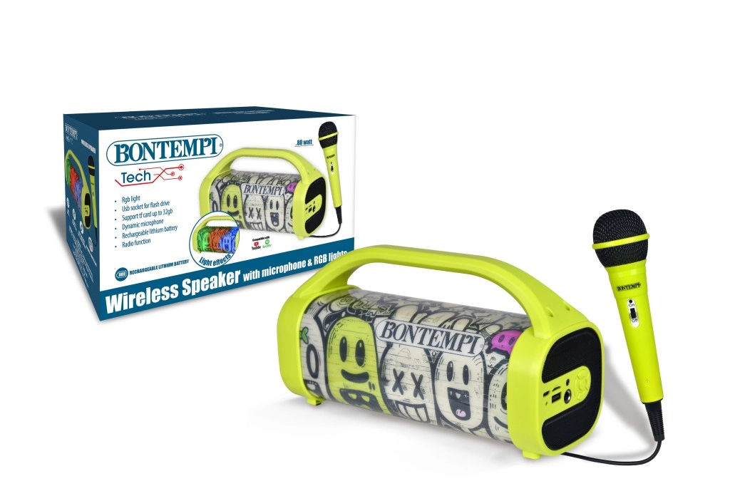 Zabaven brezžični zvočnik z dinamičnim mikrofonom za karaoke, zabave in otroške zabavice. Ponuja Bluetooth povezavo, čist in močan zvok, barvite svetlobne učinke za pravo vzdušje ter je kompakten in prenosljiv – idealen za na pot ali doma.