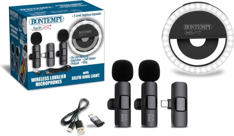 Ta praktični komplet združuje kakovostno osvetlitev in brezžični zajem zvoka v enem. Mini krožna LED luč se enostavno pritrdi in z 3 stopnjami svetlosti zagotovi naravno osvetlitev pri snemanju s sprednjo kamero. Dva lavalierska mikrofona se pripneta na oblačila in zanesljivo preneseta glas brez okoliškega hrupa, kar bodo cenili vlogerji, ustvarjalci Reels/Shorts in podkasterji.