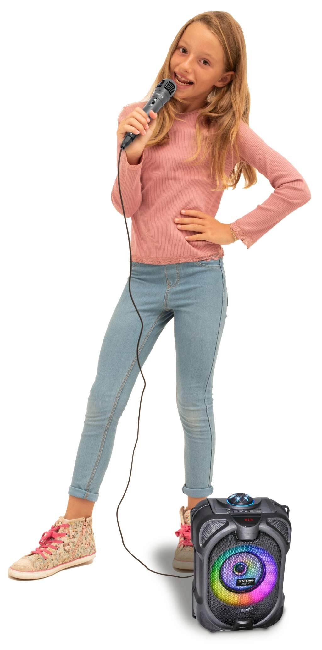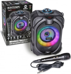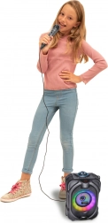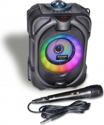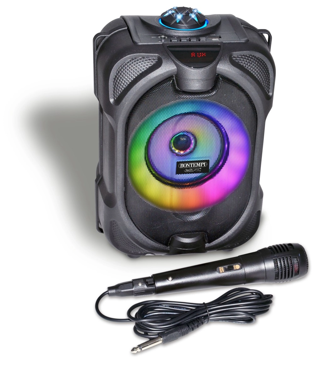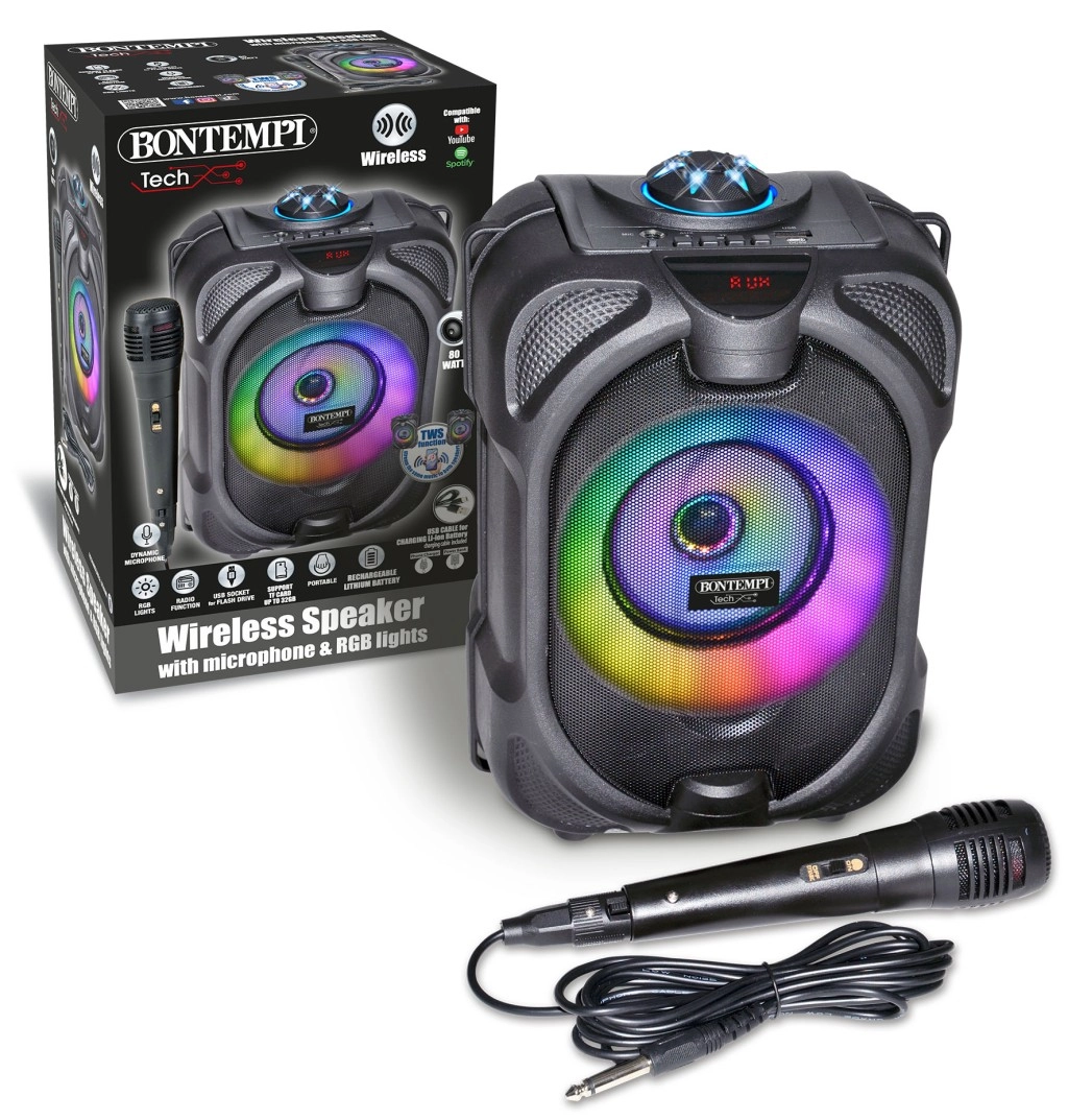 Ta večnamenski brezžični zvočnik spremeni vsako zabavo v doživetje. Zahvaljujoč dinamičnemu mikrofonu je idealen za karaoke, moderiranje in govor. Barvni LED učinki poudarijo vzdušje, medtem ko vgrajeni zaslon pregledno prikazuje način in informacije o predvajanju.