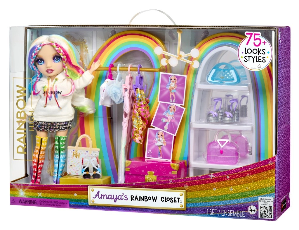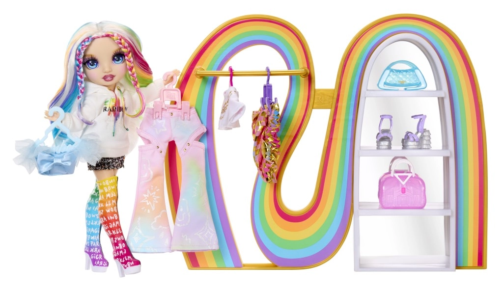 - 1 punčka, mavrična omara/stojalo, 6 modnih kosov, 2 para čevljev, 2 torbici, glavnik, garderobno stojalo s 4 obešalniki, 4 nadstropne police za čevlje