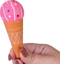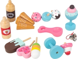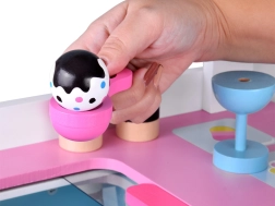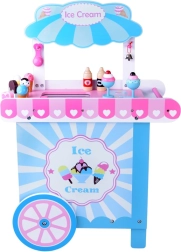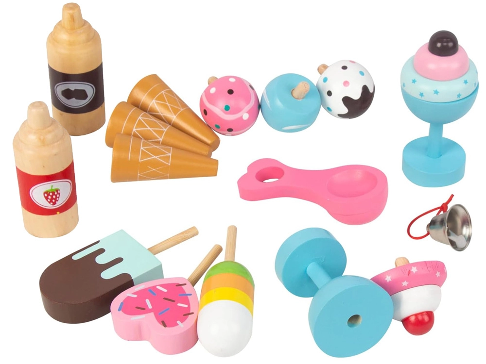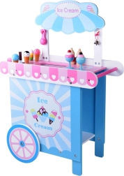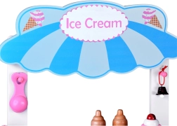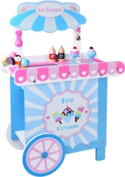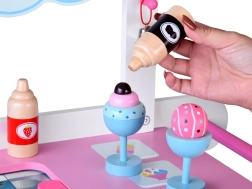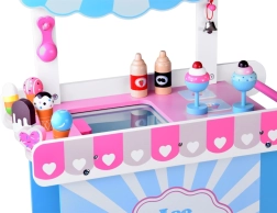 Ta stilski otroški sladoledni voziček v nežnih rožnatih in modrih odtenkih je idealen za igro trgovine in slaščičarne. Zgornji pult služi kot prodajna površina za razstavljanje kepic, kornetov in lučk, pod njim pa najdete veliko polico in premični »hladilnik« za shranjevanje dobrot in dodatkov. Praktični dve kljukici in srebrn zvonček ustvarjata avtentično izkušnjo serviranja.